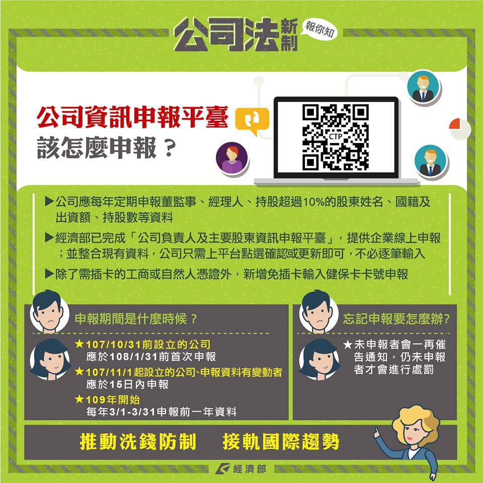 公司應至中央主管機關建置或指定之資訊平臺申報董事、監察人、經理人及持有已發行股份總數或資本總額超過百分之十之股東之姓名或名稱、國籍、出生年月日或設立登記之年月日、身分證明文件號碼、持股數或出資額及其他中央主管機關指定之事項,未依規定申報者經通知限期改正未改正者,處代表公司之董事新臺幣五萬元以上五十萬元以下罰鍰。經再限期通知改正仍未改正者,處以罰鍰,其情節重大者,得廢止公司登記。