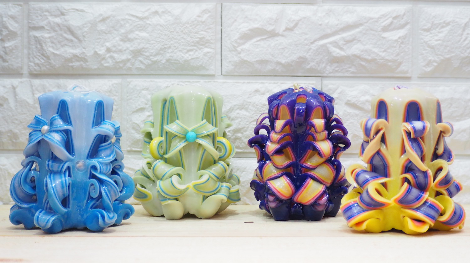 平平無奇的一支蠟燭可以作出甚麼變化? 蠟燭雕刻手工藝術絕對會令你讚歎著迷。 顏色的搭配丶人手的雕刻丶蠟燭外圍的刻意扭曲… 一切一切旨在讓蠟燭核心的光芒能夠像萬花筒一樣,散發著變化多端的色彩丶層次和線條。 箇中牽涉的手工技藝,藝術涵養極高,每個完成的手工透光蠟燭雕刻高雅精緻之餘亦實用非常,絕對是一件惹來艷羨目光的家居裝飾藝術。