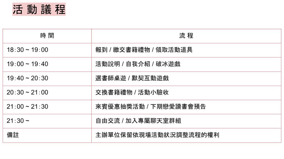 1. 報名成功者請於參加活動前準備「書籍交換禮物 」