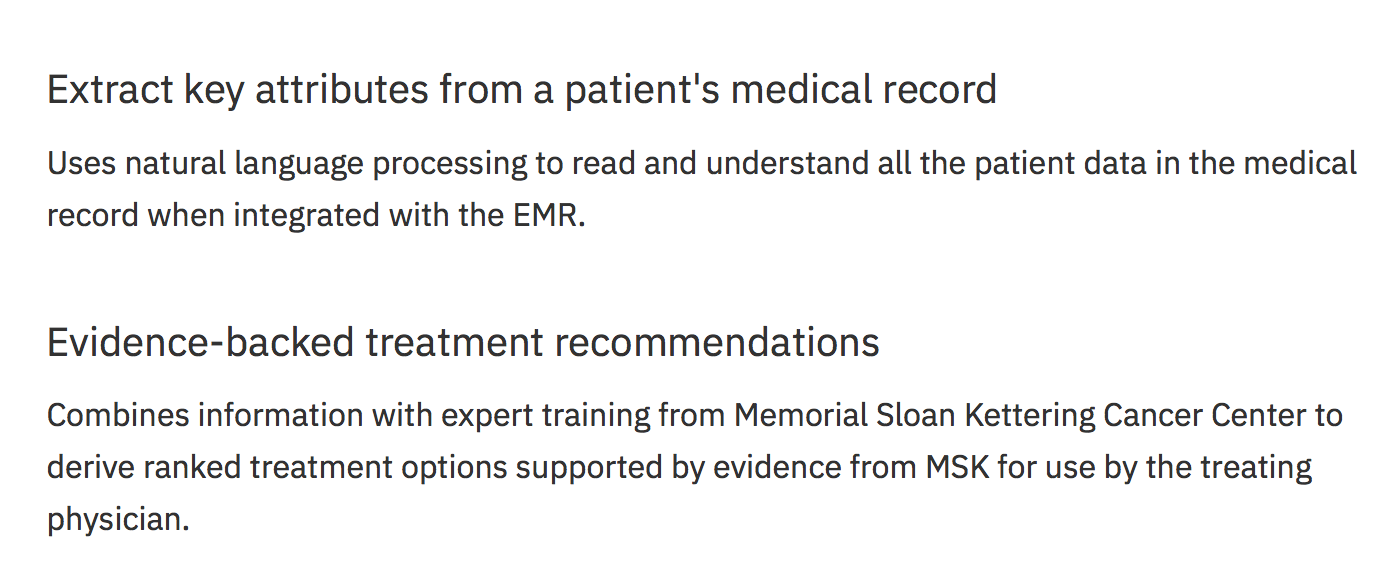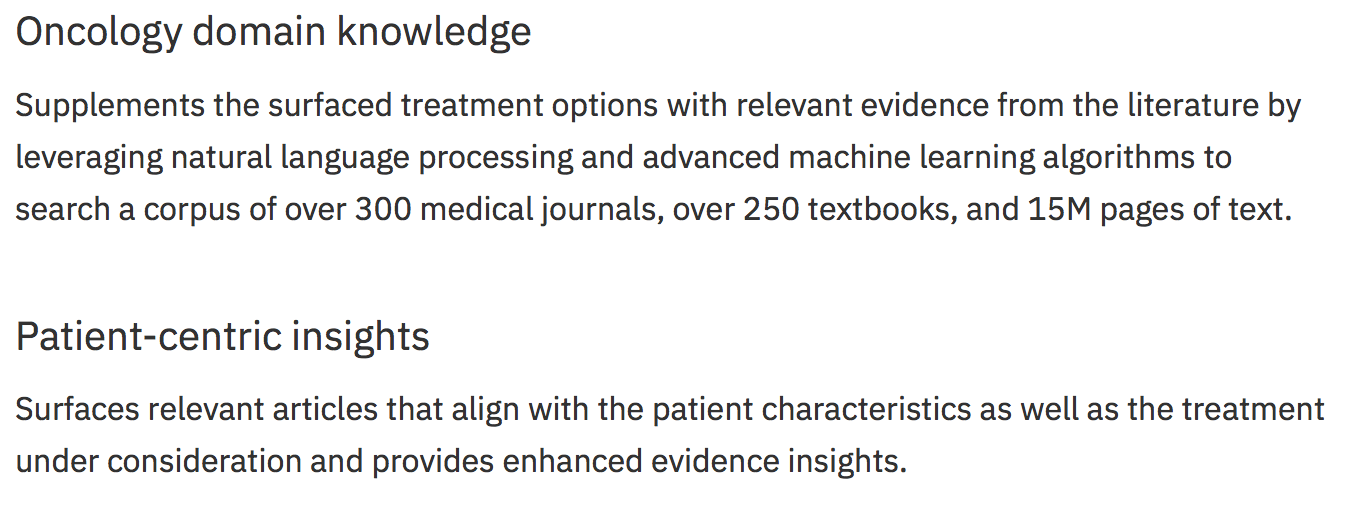 *Watson for Oncology combines leading oncologists’ deep expertise in cancer care with the speed of IBM Watson to help clinicians as they consider individualized cancer treatments for their patients. Watson for Oncology is a solution that is fueled by information from relevant guidelines, best practices, and medical journals and textbooks. The solution assesses information from a patient’s medical record, evaluates medical evidence, and displays potential treatment options ranked by level of confidence, always providing supporting evidence. The oncologist can then apply their own expertise to identify the most appropriate treatment options.