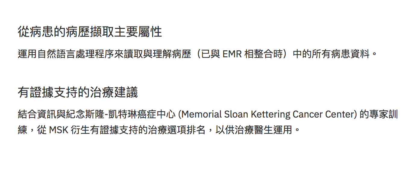 *Watson for Oncology 結合腫瘤醫生在癌症照顧方面的深入專門知識與 IBM Watson 的速度,以協助臨床醫生考量病患的個人化癌症治療。Watson for Oncology 解決方案的推進動力是來自相關準則、最佳做法以及醫療刊物與教科書的廣泛資訊。 此解決方案會評估病患病歷資訊、評估醫療證據,並顯示依信賴水準排名的可能治療選項,而且一律提供支持證據。腫瘤醫生可接著運用本身的專門知識,以找出最合適的治療選項。