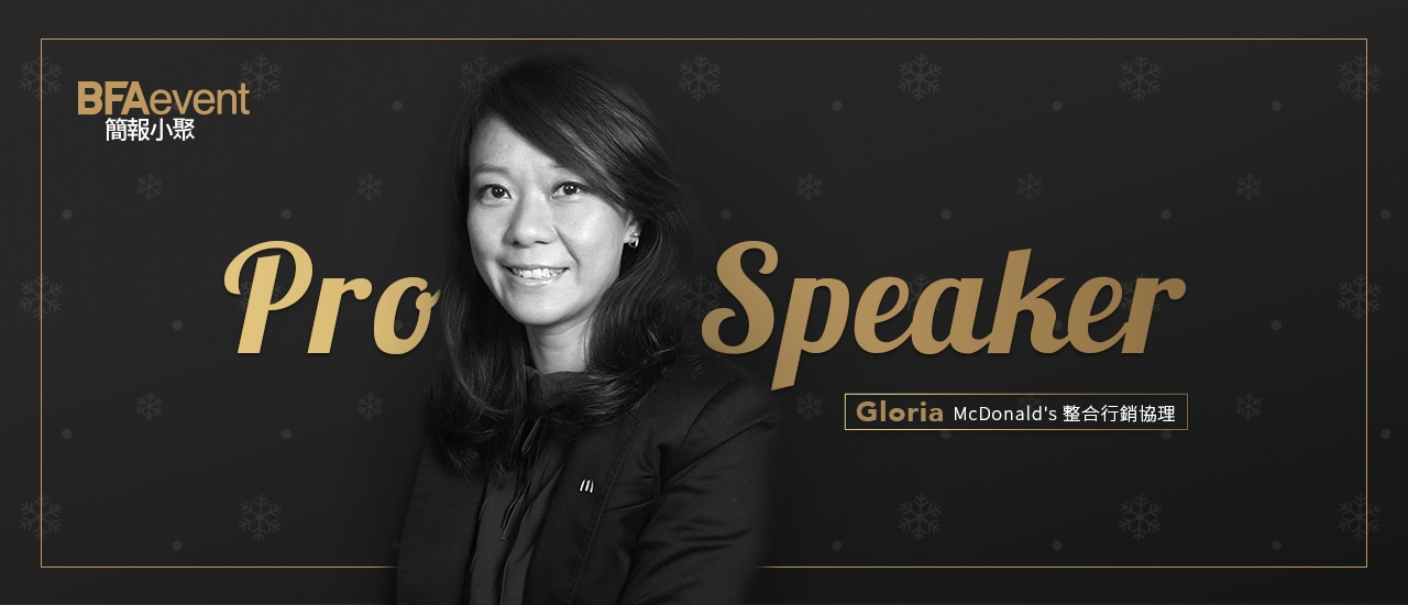 Gloria(李俞頻)目前任職於和德昌麥當勞,擔任整合行銷事業部品牌行銷協理,主要負責企業品牌體驗式行銷,新興品牌創建規劃,例如:McCafé 導入品牌(讓對話更有溫度),Experience of The Future 創建未來餐廳品牌視野,Signature Collection 極選系列品牌上市將漢堡精品化。擁有 20 年以上廣告及行銷相關經驗,曾服務麥肯廣告集團以及外派中國麥當勞。身為麥胞 15 年,血液裡流著番茄醬,是麥當勞品牌的狂熱份子,也是 2018 年麥當勞品牌在地化的重要推手,一舉將戴資穎與麥當勞劃上等號。