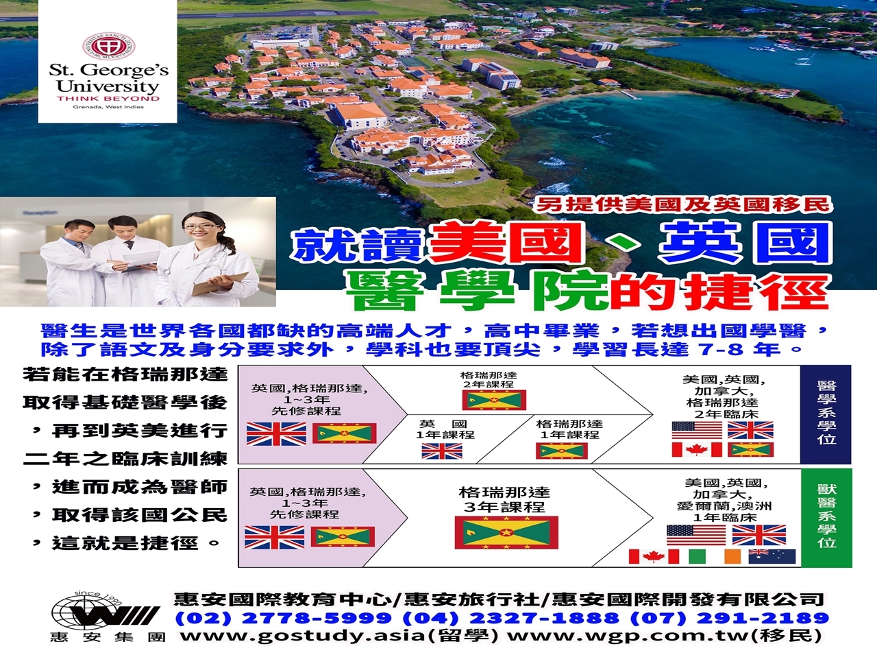 聖喬治大學St. George's University 成立於1976年,是想要就讀醫學院的學生最嚮往的學府之一。聖喬治大學致力於為全球各地提供訓練有素的醫師,並以吸引世界各地最有才華的人才。