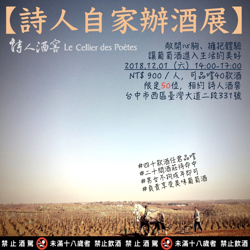 2018.12.01(六)14:00-17:00 詩人自家辦酒展 ;NT$ 900 / 人,可品嚐40款酒