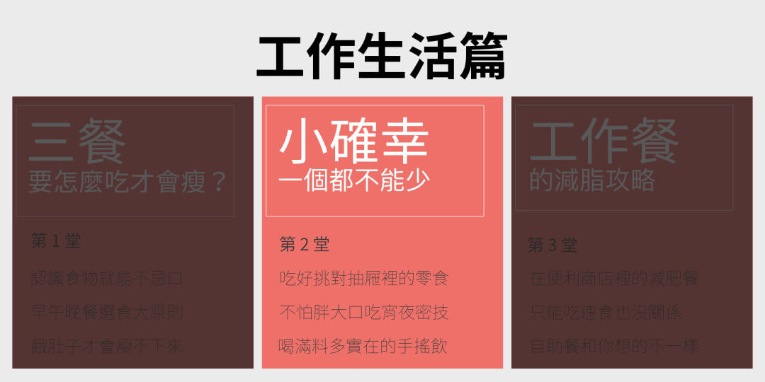 第五場講座:工作生活篇的第二堂 - 小確幸一個都不能少,你將學會吃好挑對抽屜裡的零食、不怕胖大口吃宵夜秘技、喝滿料多實在的手搖飲。
