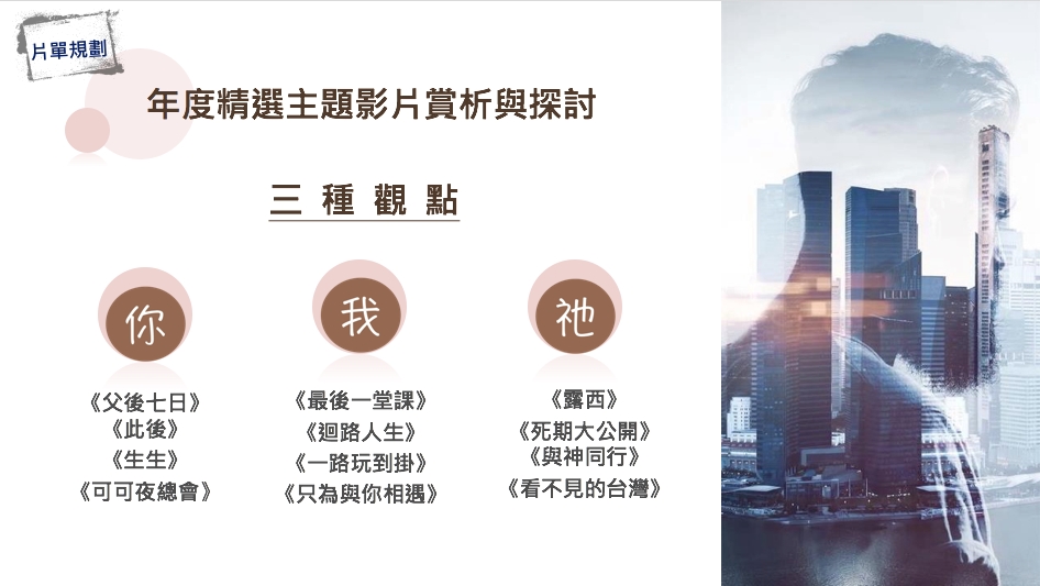 ➡️你的觀點:與自己親近的人離別時,我們可以怎麼自我療癒、並給予離開的人祝福?從影片你/妳的觀點切入協助大家思考,當他人走到了生命終點站時,身為陪伴者的我們能夠以什麼樣的態度去面對並化解情緒。精選影片:《父後七日》、《此後》、《生生》、《可可夜總會》。