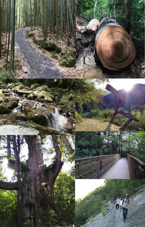 由登山口開始,我們要走5公里的步道,才能到巨木群的入口。一路上竹影扶疏,林蔭相間,十分舒爽。林下的段木上,栽種美味的香菇,斜坡上栽種著泰雅族人最愛的小米,蜿蜒的山路,一轉彎一回頭,就是一篇美麗的景緻。眺望遠方山林,續行不久,就到了巨木區了。共有九棵巨木的巨木區,是上帝聽到頭目祈禱後所應許的神秘之地,巨大的林木,歡迎著我們的到來,這些山的子民,一如山的熱情,歡迎您來親近,愛護,百千年的歲月,造就他們的巨大,讓他們得以守護這片山林,我們怎能不抱持尊敬之意呢?