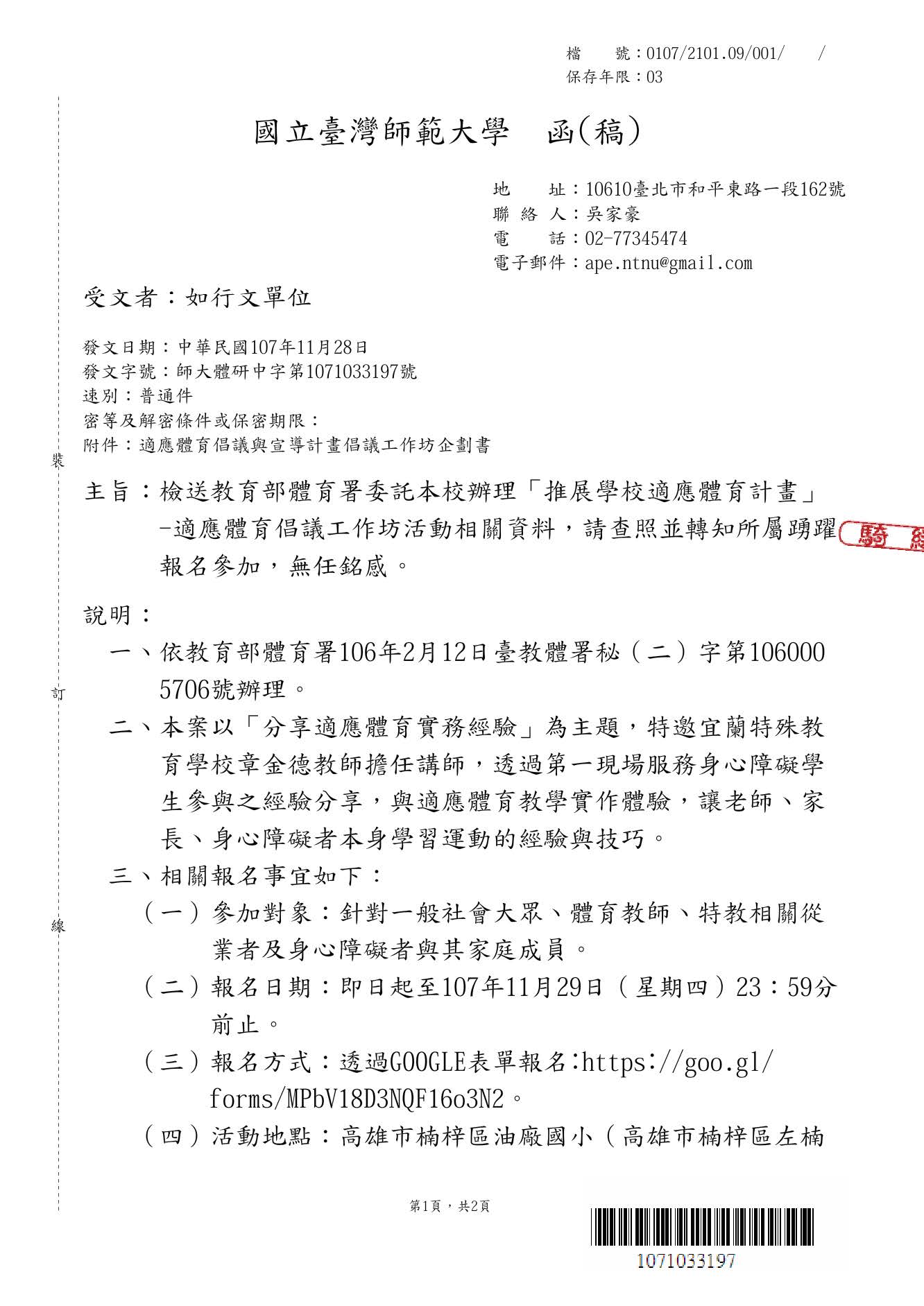 報名相關問題請洽 : 國立臺灣師範大學 吳家豪 專案助理 Email: ape.ntnu@gmail.com Tel: 02-7734-5474