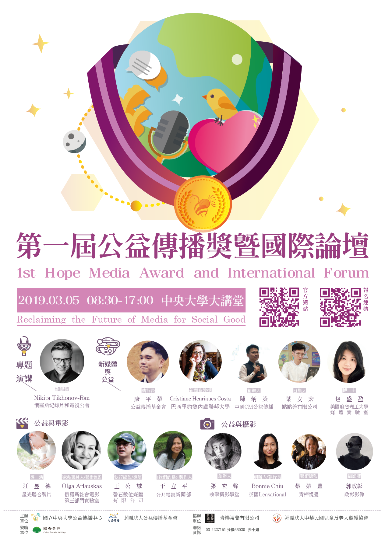 為促進公益傳播領域之新知與經驗交流,國立中央大學公益傳播中心及財團法人公益傳播基金會特辦理公益傳播獎暨國際論壇,期盼本論壇能成為公益傳播之國際交流平台。