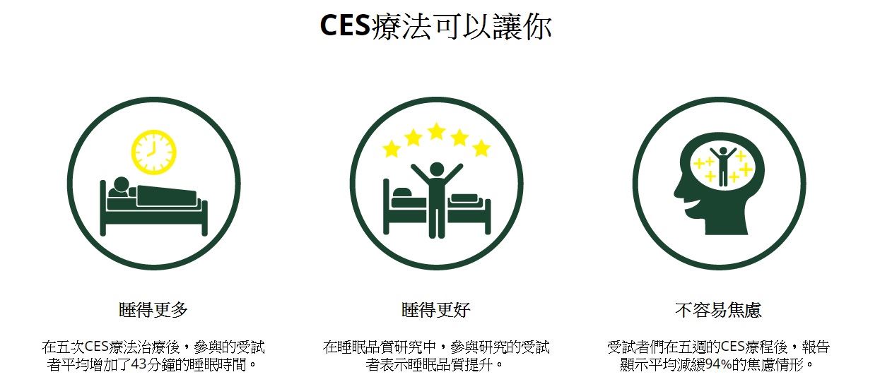 經顱微電流刺激法(CES療法)是透過極低的安全電流量(不到一般低週波治療儀的1/100),以專利波形讓使用者大腦自行分泌主管心理及情緒活動的各種神經傳導物質,例如:「腦內啡」、「乙醯膽鹼」、「5-羥色胺」、「色胺酸」等,以達到調節情緒認知、改善異常腦電波、強化α波、消除緊張感、放鬆...等效果。因此CES療法能夠達到有效改善失眠、抒解壓力的效果。