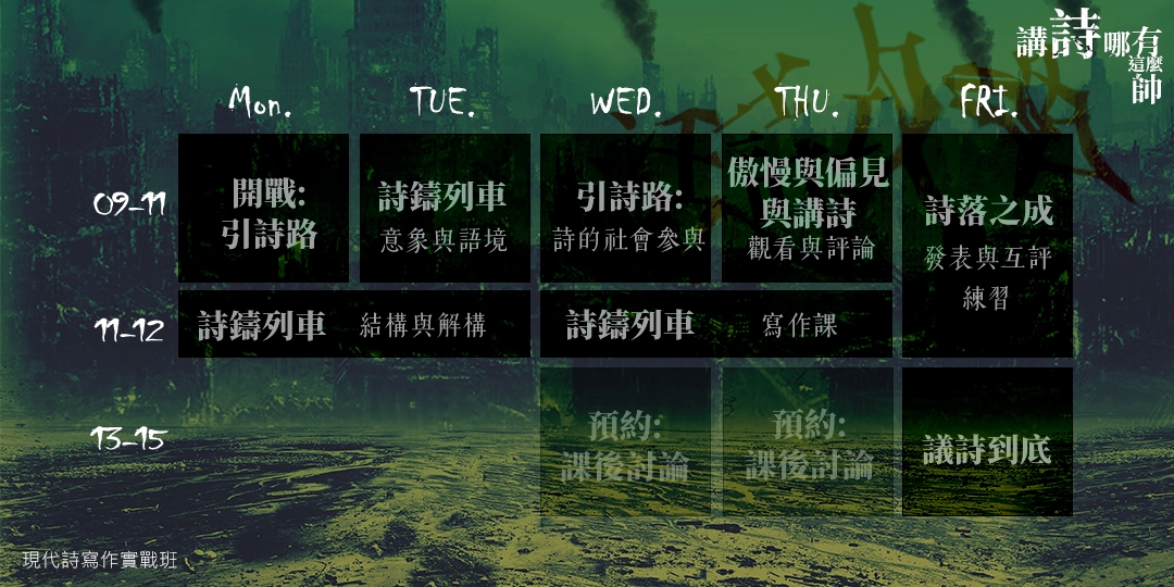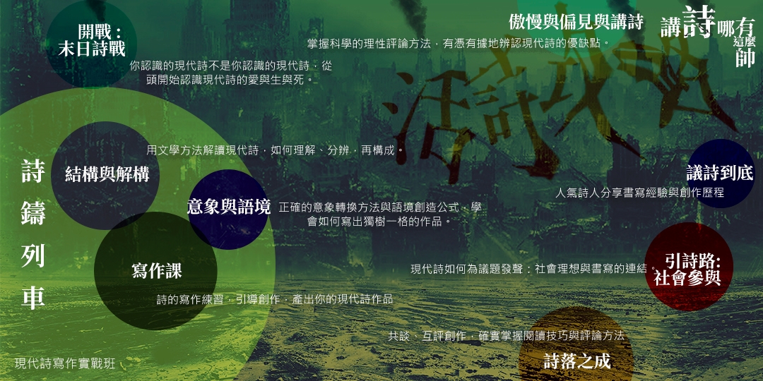 『講詩哪有那麼帥』析解多年現代詩入門者的苦手點,從理論、技巧、應用等多方位設計課程內容,坐上詩鑄列車,21小時帶領你備齊現代詩的基礎實戰力!