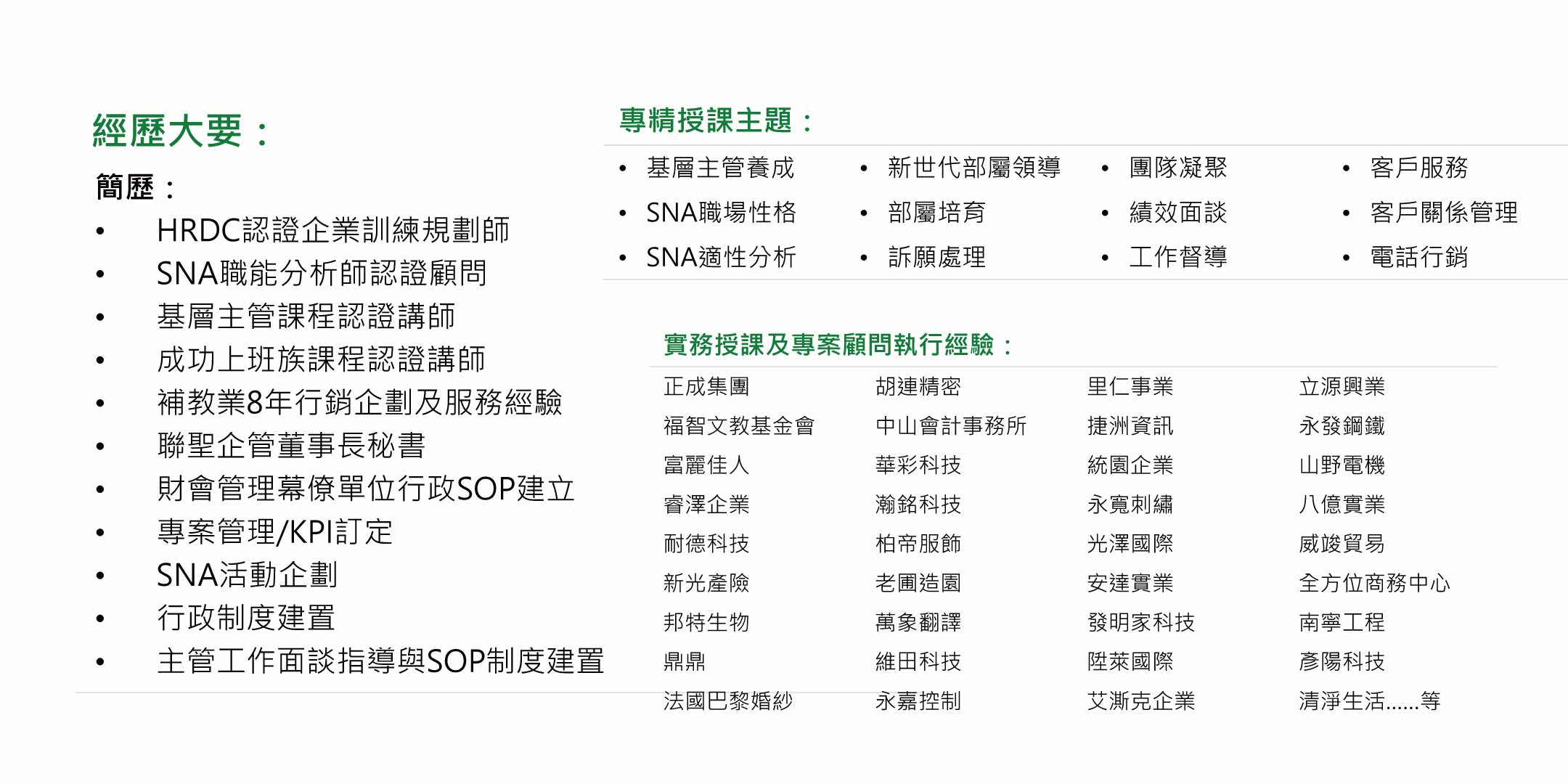 (唐美娟) 老師授課時熱情親切,能夠快速地拉近與學員間的關係,以此提升學員的學習意願以及學習成效,深受學員喜愛。老師擁有深厚的經營、管理、營銷、組織、性格分析知識背景,課程架構完整,利於學員以系統化的方式學習吸收(知識理論)。扎實的實務經驗,在授課時更注重「課程內容能夠如何反應在學員的實際工作中」,擅長導入案例解析、實務操作等運課方式(實務經驗)。熟悉體驗學習的重要性,能透過深入淺出的體驗活動,幫助學員加深學習記憶,從活動中自發性領悟到課程的重要觀點(體驗學習),利於學員將課程內容導回實際工作中使用。