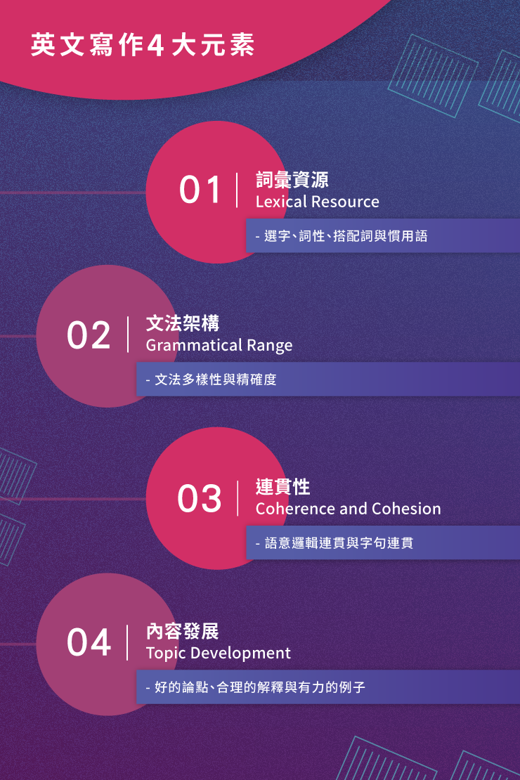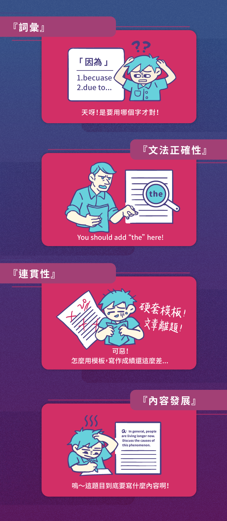 英文寫作的好壞不只侷限於文法的對錯跟單字量的多寡,而取決於是一篇文章的架構跟邏輯。多數台灣學生過度依賴「寫作模板」,以為模板越複雜、字數越多,分數就會越高,卻忘了檢視文章的內容是否合乎邏輯。甚至,只在乎如何用寫出正確的英文句子,盲目查單子、找翻譯,最後才發現英文中根本沒有這種用法。