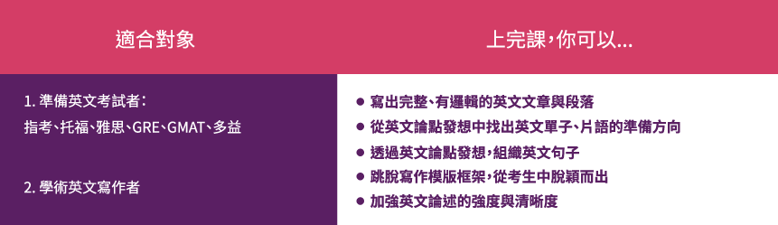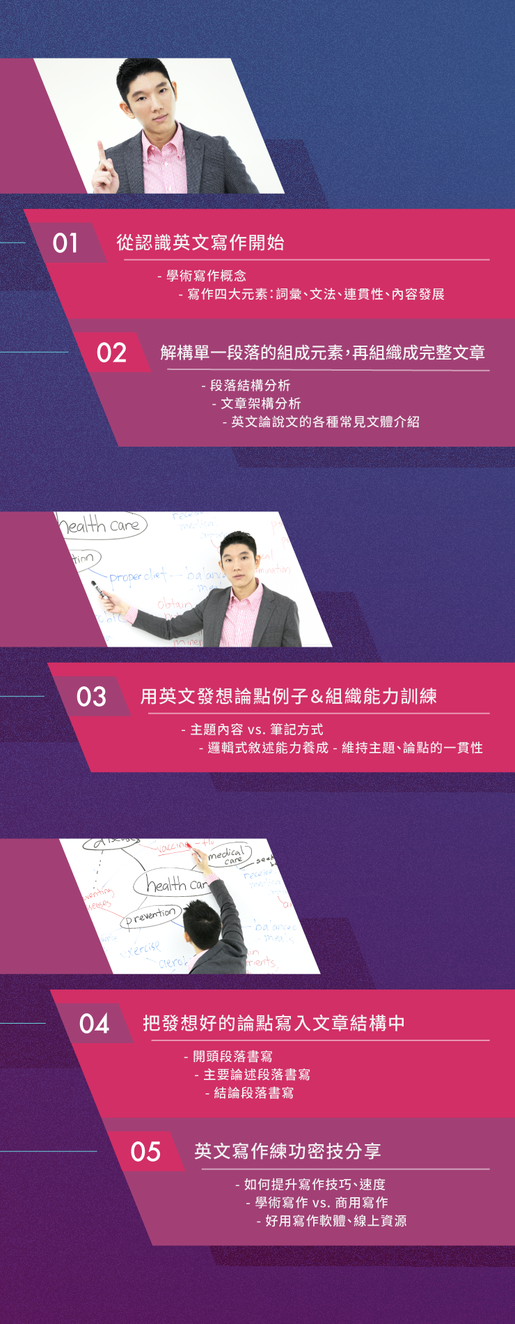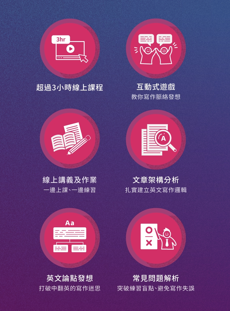 盲目地練習寫作、只糾正文法卻不關心單字片語的實際用法(例如:到底是 eat healthy 還是 eat healthily 呢?),只會讓你的英文寫作不斷被中文思考給綁架。想要解決上述這些問題,你應該先從「寫作四大元素」開始,了解「英美人士的邏輯思考模式、表達論述方式、英文寫作架構」,並學習如何用英文單字跟片語來發想你的文章論點,這樣就能跳脫中文的框架,將你想要表達的內容輕鬆組織成道地的英文文章。