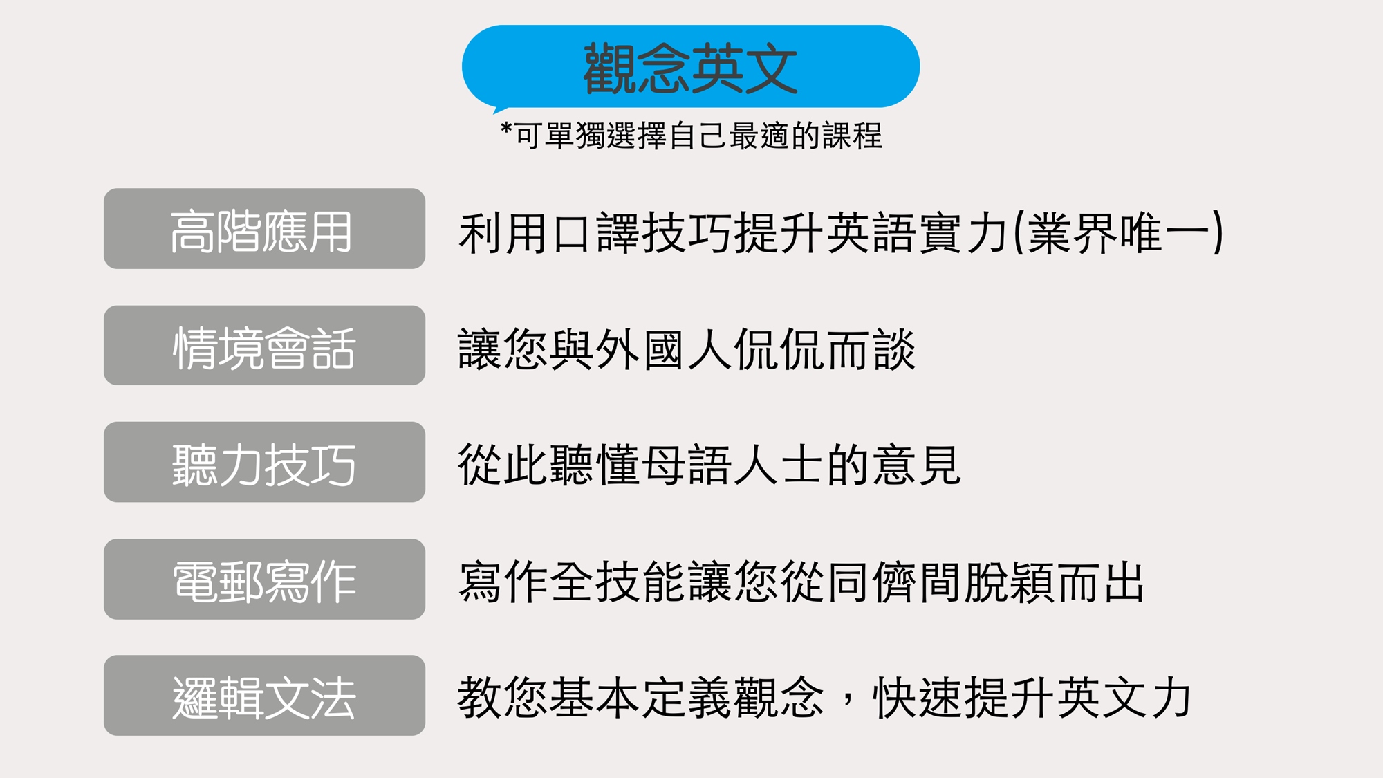 課程著重在培養日常會話及商務口說能力,給你最實用的英語會話能力,讓你用英語也辯才無礙!