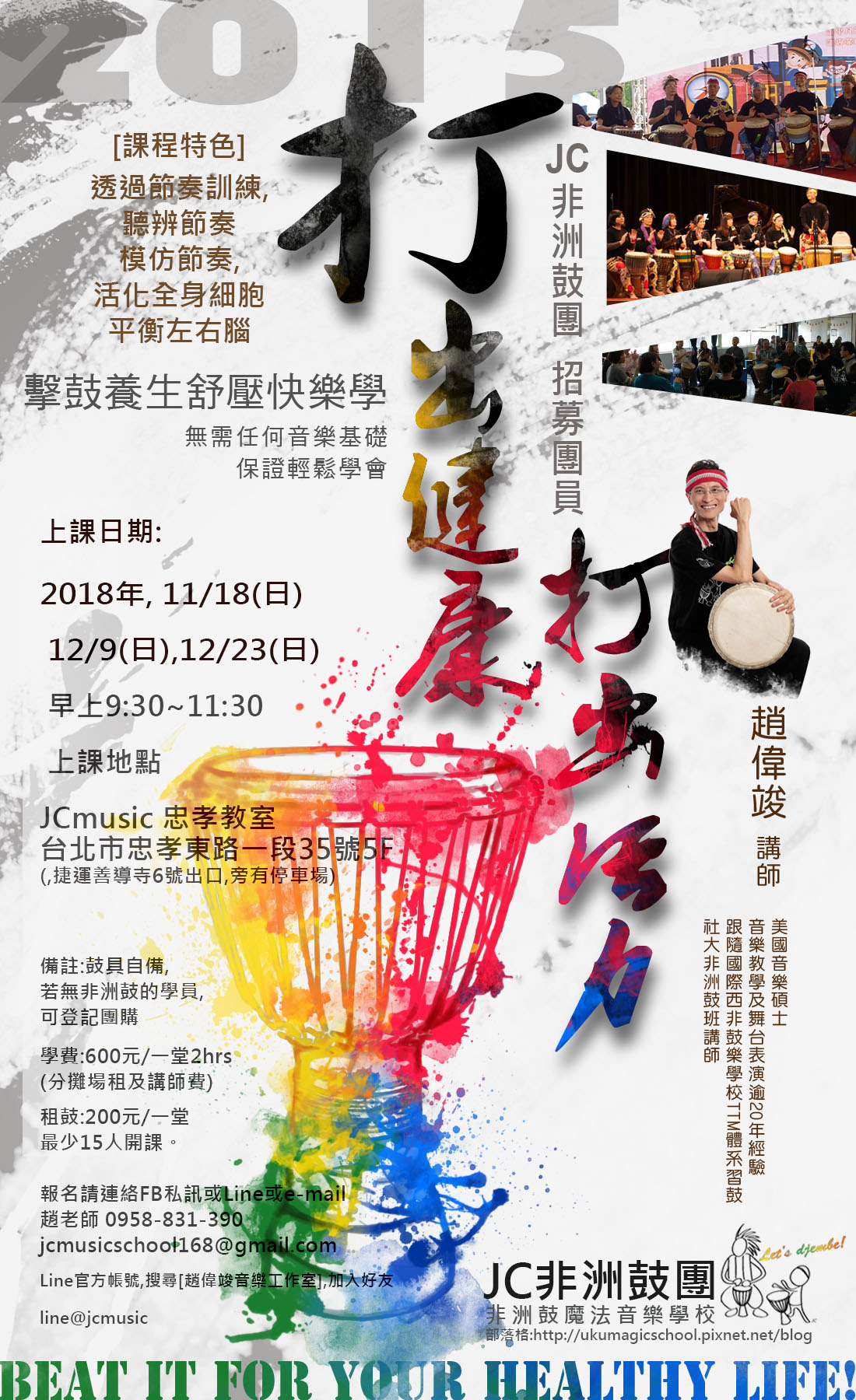 2018慶祝聖誕就要來點不一樣的活動~無需任何音樂基礎.無年齡限制.可三代同堂.只要有一顆想要快樂的心,保證讓你在無壓力的非洲鼓舞氛圍中,學會非洲鼓打擊,非洲舞蹈律動.歌唱及鼓圈合奏..伴隨著耶誕組曲...沉浸在非洲音樂文化的洗禮~我們將邀請到在中國大陸及台灣已經成功推廣多年.並編著多本教材.在教學及表演擁有豐富經驗的JC非洲鼓魔法音樂學校創辦人-趙偉竣老師親自帶領大家一步步進入非洲鼓打擊世界的多元統合音樂活動~打出健康活力!歡慶聖誕就趁現在~千萬別錯過!