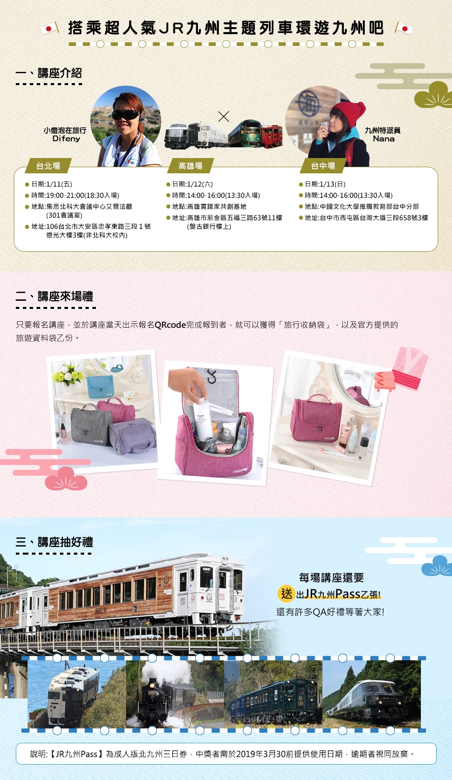 【JR九州鐵路輕旅行系列講座】1/11台北場、1/12高雄場、1/13台中場