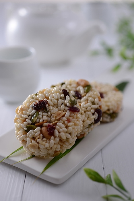 將飽滿的熟米脫水後成「米籽乾」反覆翻炒成型,加入蔓越莓、葡萄乾,等堅果增添風味層次,小巧一口酥尺寸每口酥脆紮實,透過雙手為米香塑型、也為年節帶來團圓氣氛。