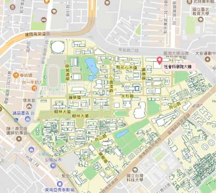 捷運路線: (1.)捷運科技大樓站(文湖線):捷運科技大樓站出口左轉,沿著復興南路步行至辛亥路交叉口,過馬路即可抵達臺大,右手邊大樓即為社會科學院,步行路程約10分鐘。捷運科技大樓站設有Ubike,可騎乘Ubike 至臺大社科院。 (2.)捷運公館站(新店線):捷運公館站,沿著羅斯福路步行進入臺大校園,循椰林大道直行,往社科院大樓方向,步行約30分鐘。捷運公館站設有Ubike,可騎乘Ubike至臺大社科院。 |