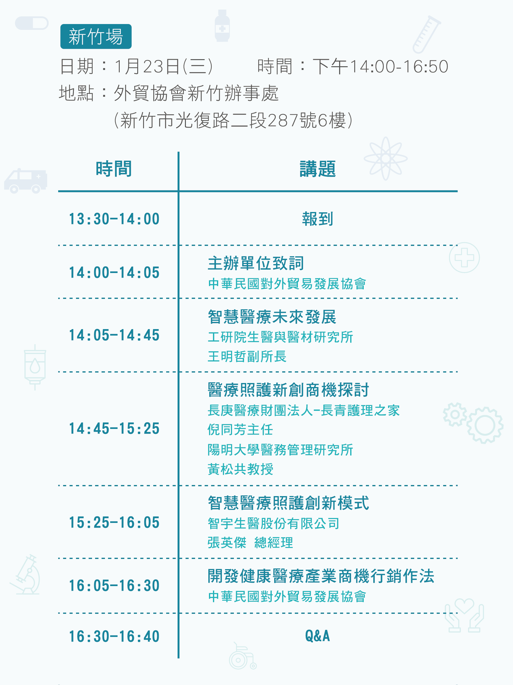 為對外推廣臺灣優質醫療服務、技術與產品於全球需求市場,外貿協會於明(108)年1月及2月,分別在臺北、新竹及臺南各舉辦一場「智慧醫療及照護產業趨勢說明會」,邀請國內健康醫療及照護產業專家分享國際相關產品及服務的發展趨勢,並提供業界先進行銷海外策略觀點。