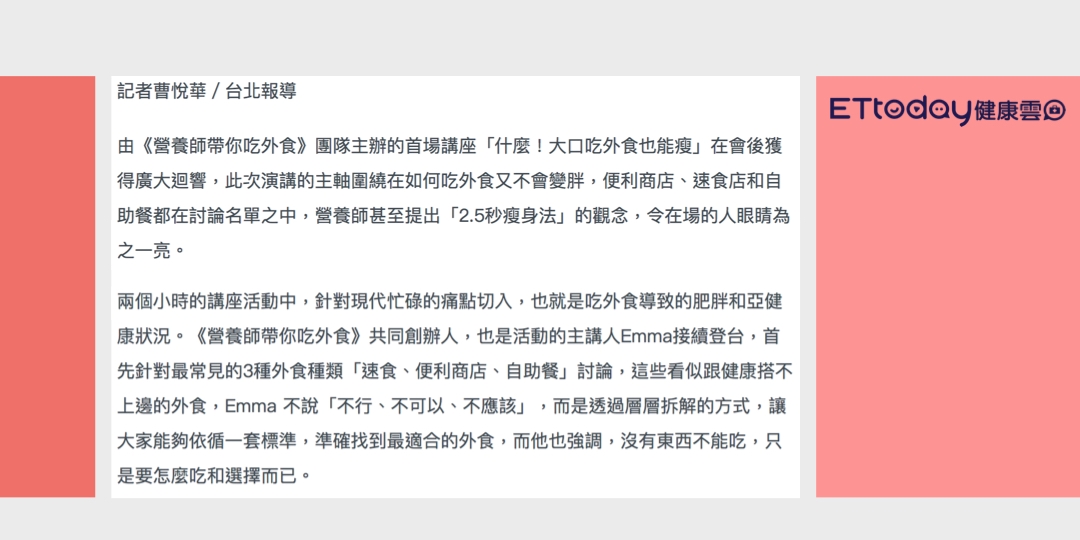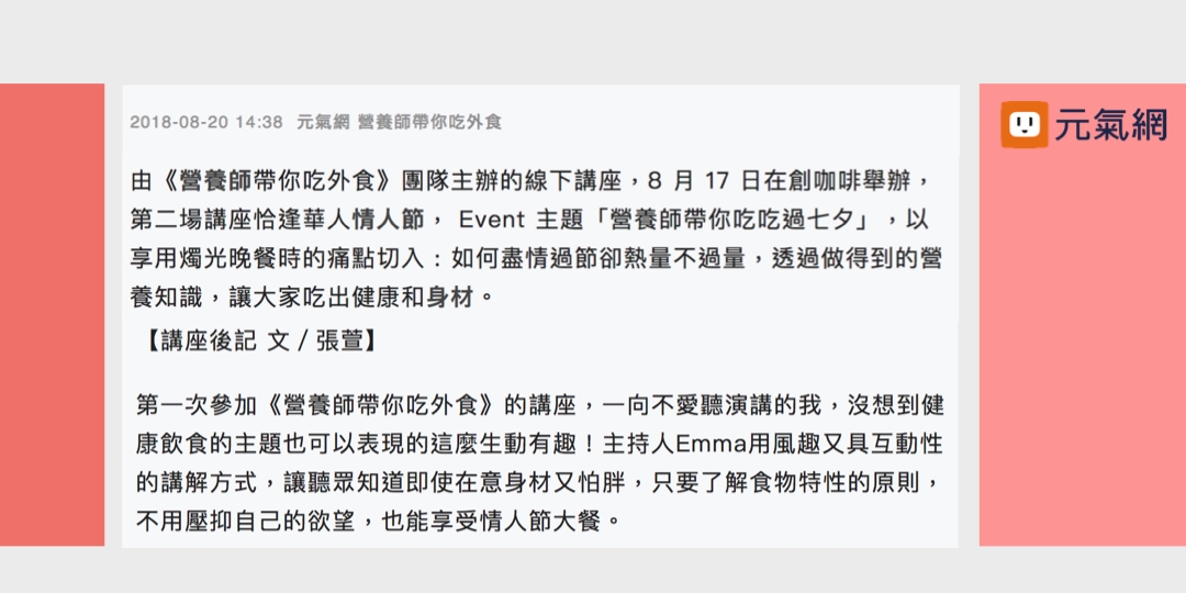 【營養師帶你吃外食】是專為外食族量身定做的知識型社群,總貼近大家的痛點來撰寫文章,因此專欄常被 ETtoday、元氣網、早安健康等多家媒體轉載。除此之外,每月一次的線下講座,營養師歸納出外食者的常見問題,從「工作生活篇」&「日常困擾篇」總共 6 堂課,系統化地解答你的十萬個為什麼。