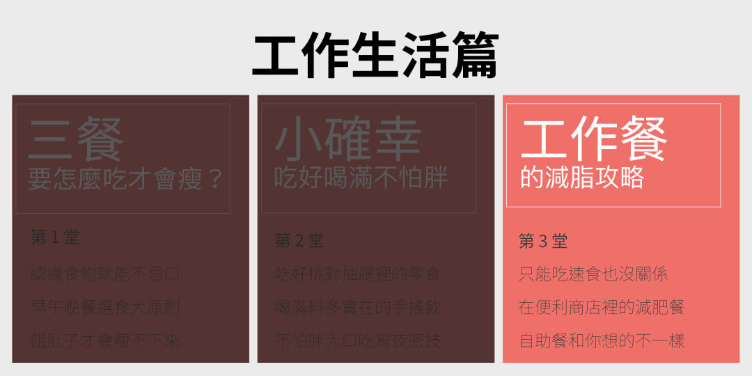 第六場講座:工作生活篇的第三堂 - 工作餐的減脂攻略,你將學會只能吃速食也沒關係、在便利商店裡的減肥餐、自助餐和你想的不一樣。