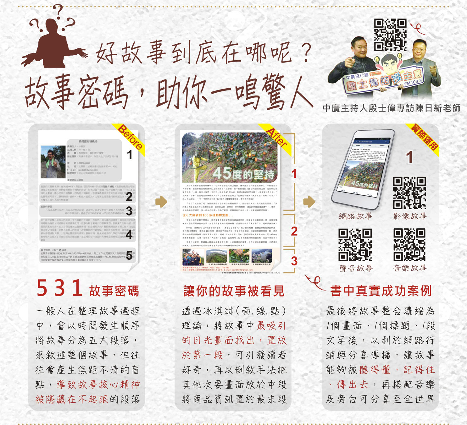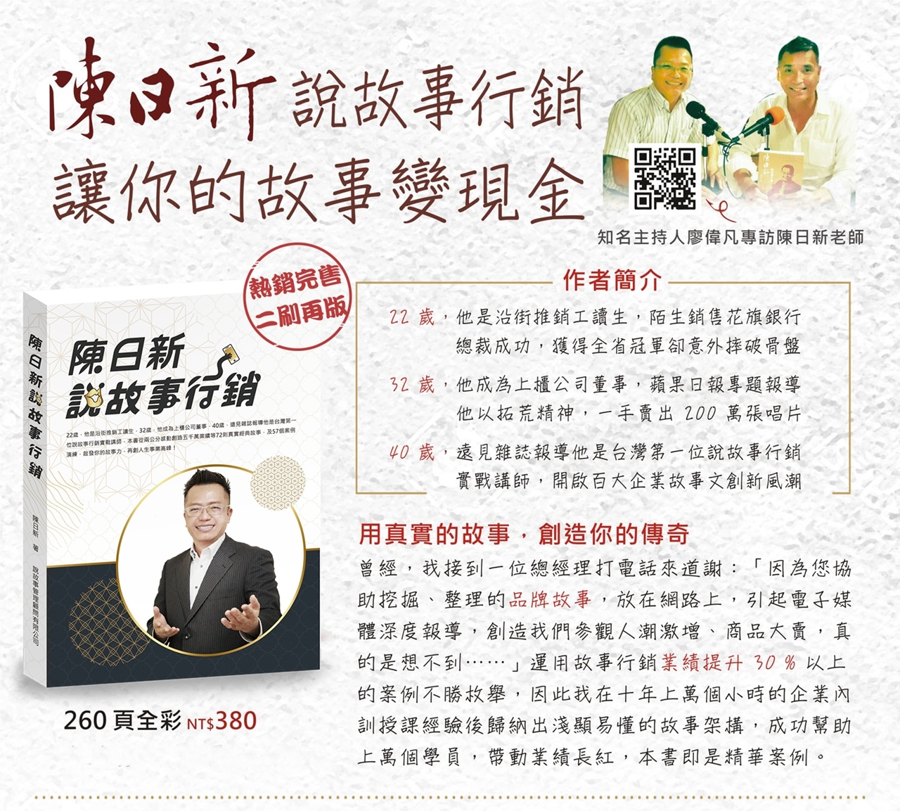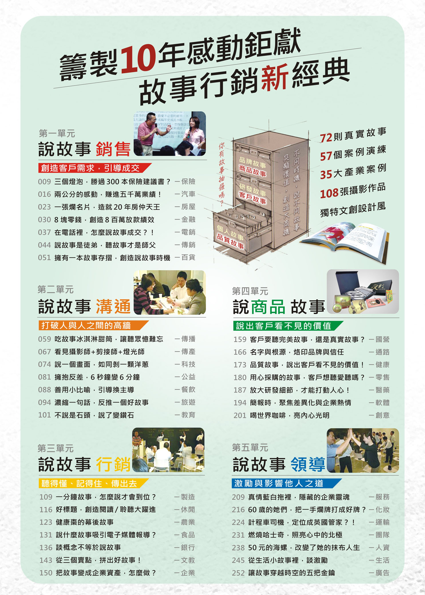 後來,我把這些經驗出版成【熱情行銷俠的28個分享】一書,引起賓士汽車等五百大企業的注意,紛紛找我在企業教授故事行銷這個議題,一說8年。現在,我已經把這段顧問期間參與的數千個企業精彩故事,濃縮成72則真實案例,希望能啟發你創造屬於你或你公司/商品的傳奇故事!
