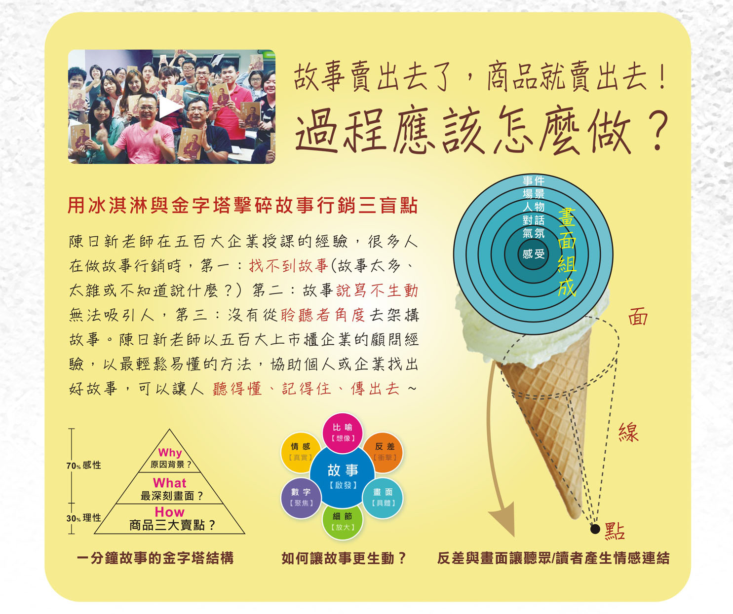 曾經,我接到一位學員興奮打電話給他說:「老師,您教的故事行銷,讓我們這個月招生大爆滿,營收成長了好幾倍。」也有位總經理打電話來道謝:「因為您協助挖掘、整理的品牌故事,放在網路上,引起電子媒體深度報導,創造我們參觀人潮激增、商品大賣,真的是想不到....」許多好朋友運用故事行銷之後,業績提升足足超過30%以上…