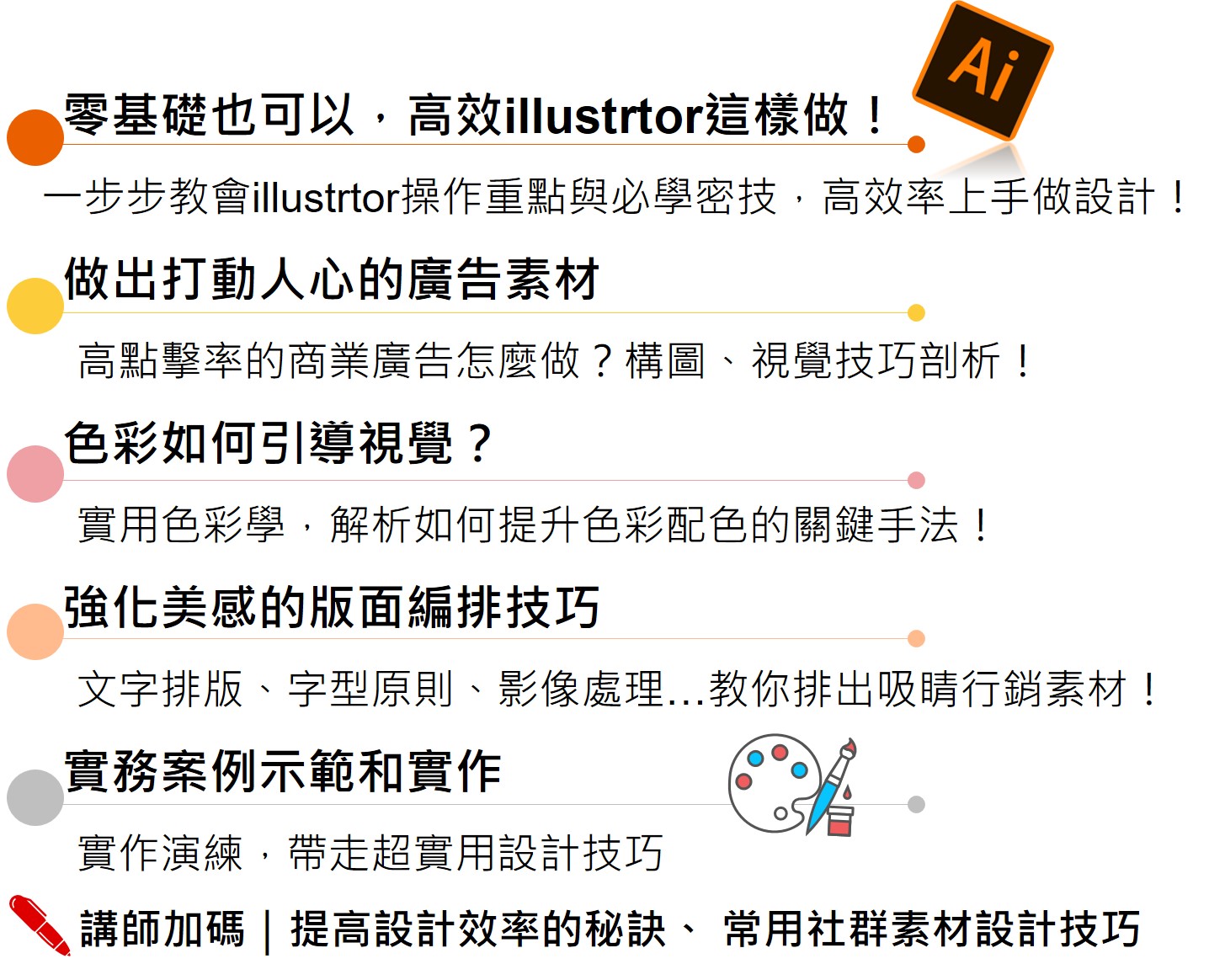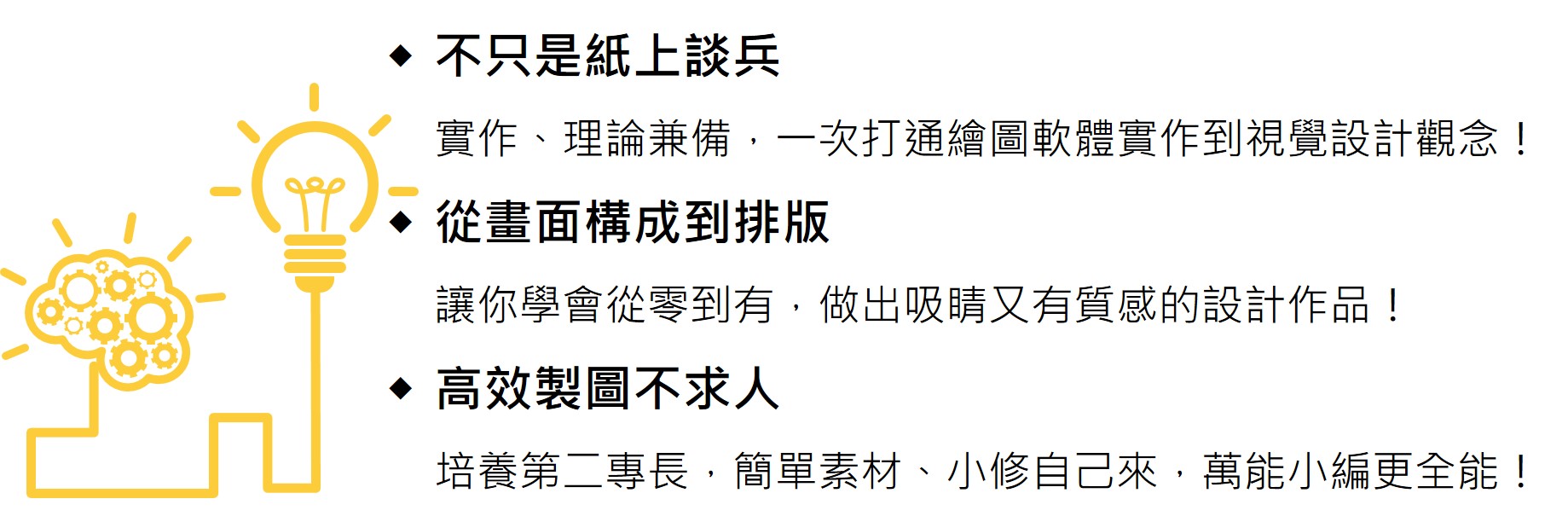 這次課程,為解救零基礎、卻又需要設計技能的你,邀請到AAD亞洲視覺藝術交流平台執⾏長陳育⺠老師,從設計實務⾓度出發,由淺入深,一步步帶著大家從繪圖軟體的重點指令與實作方法、專案創意發想到如何做出高點擊率的行銷素材,更教你學會整體畫面構成到色彩策略、字體原則、影像處理等超實用技巧,讓你快速上手,下課即擁有掌握專業軟體的操作與設計基礎,培養設計技能的第一堂課,大幅提升職場競爭力。