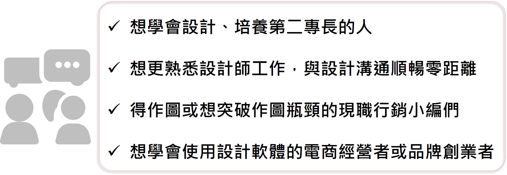 而對於需要設計技能的你,你可能是小編/行銷,經常需要和尚兼撞鐘,得扛下產出行銷素材的設計任務,為了無法產出好看的發文素材、與設計而煩惱不已。或者是曾嘗試過使用繪圖軟體自行作圖,反而花了大量時間美編,卻好像還是達不到標準,不只無法過關,更令人厭世灰心。又或者是想培養第二專長,從基礎開始快速提升設計技能的朋友,這堂課,將是你不可錯過的選擇。