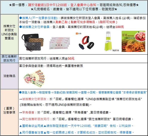 - 女士活動費用:600元;活動5日前匯款,促銷價300