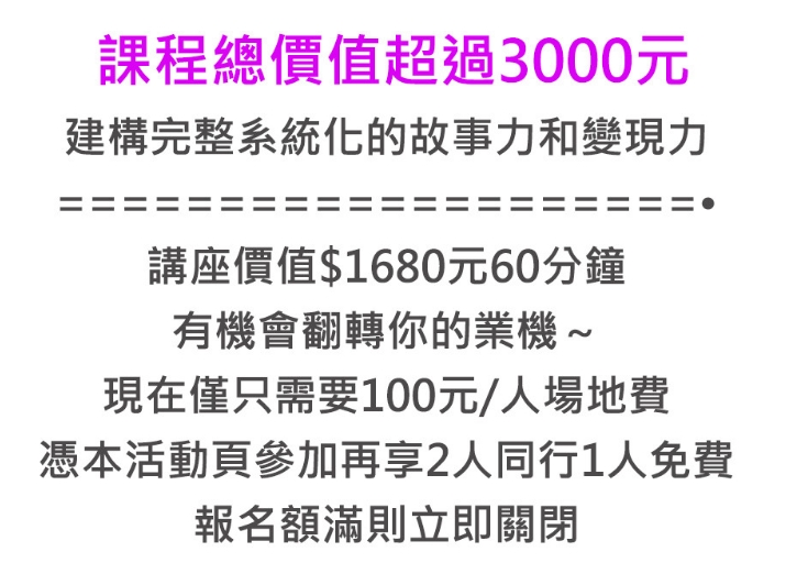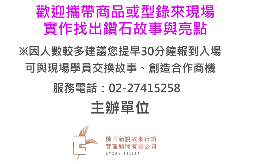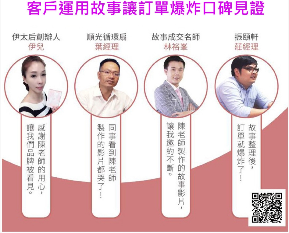 曾經,我接到一位學員興奮打電話給他說:「老師,您教的故事行銷,讓我們這個月招生大爆滿,營收成長了好幾倍。」也有位總經理打電話來道謝:「因為您協助挖掘、整理的品牌故事,放在網路上,引起電子媒體深度報導,創造我們參觀人潮激增、商品大賣,真的是想不到....」許多好朋友運用故事行銷之後,業績提升足足超過30%以上…