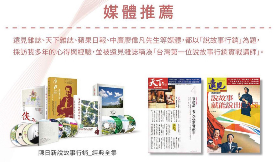 後來,我把這些經驗出版成【熱情行銷俠的28個分享】一書,引起賓士汽車等五百大企業的注意,紛紛找我在企業教授故事行銷這個議題,一說8年。現在,我已經把這段顧問期間參與的數千個企業精彩故事,濃縮成72則真實案例,希望能啟發你創造屬於你或你公司/商品的傳奇故事!