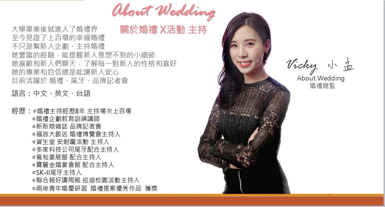 ※Vicky總監從大學一畢業就投入婚禮產業,從知名婚宴會館婚禮企劃出身,累積超過800場、近十年的主持經驗。