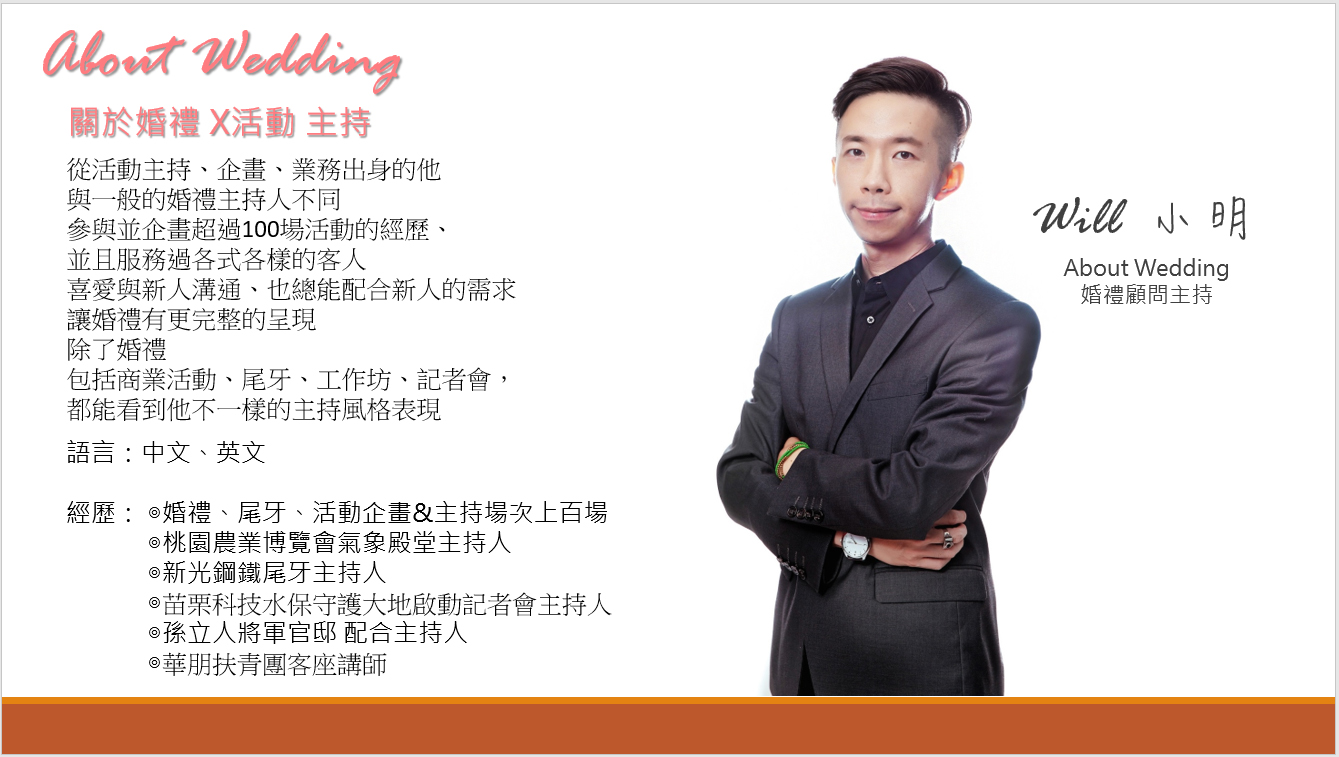 ※小明從活動主持出身,開始沒有任何的婚禮主持經驗、但憑著他的認真和個人特色,讓新人都可以放心的將婚禮交給他。