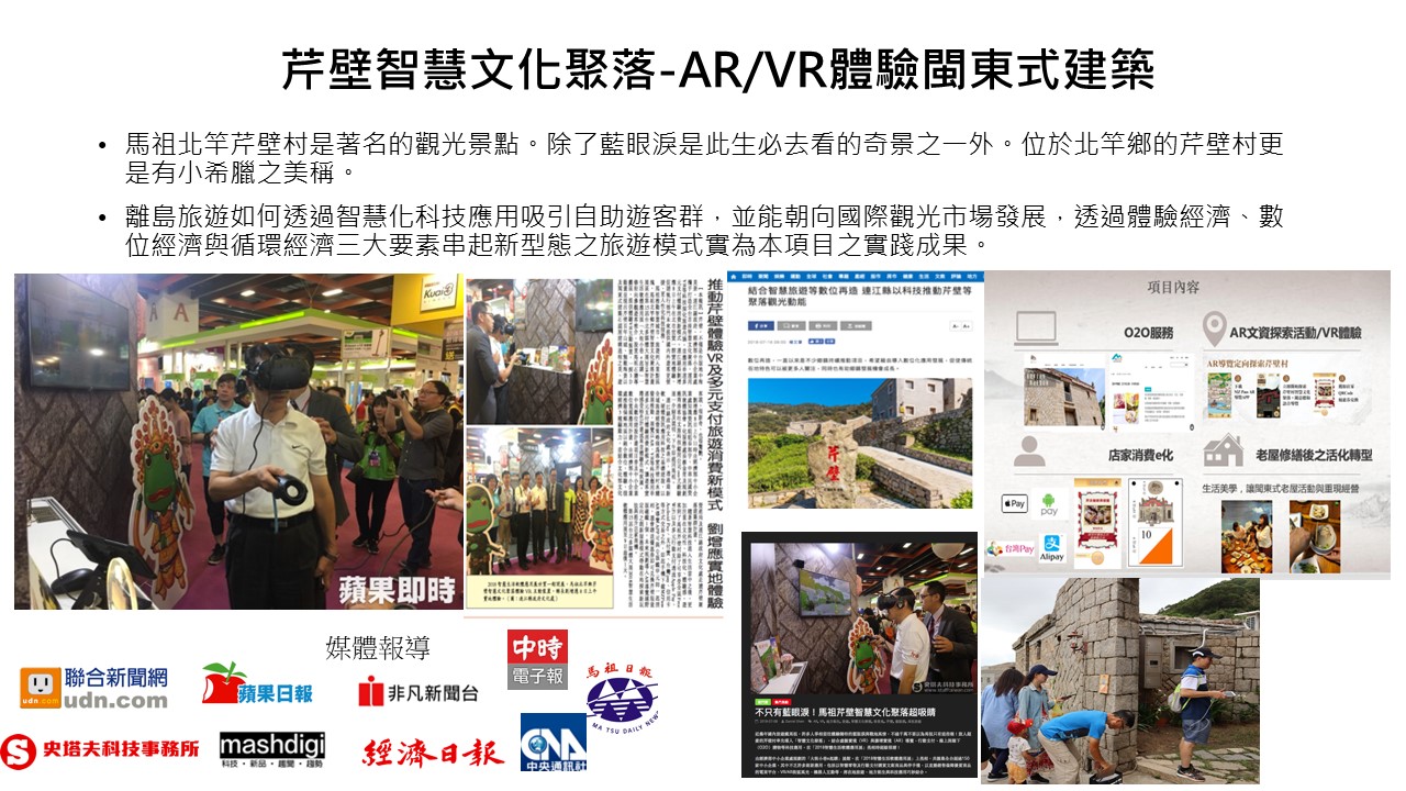 由洛客兔文旅科技顧問公司打造的馬祖芹壁VR體驗,以可愛的3D動畫及馬祖特殊風情成功吸引許多眼球。民眾到馬祖北竿鄉可透過行動裝置下載AR智慧導覽APP,即可欣賞芹壁村的建築、信仰、地景之美外,並可與當地守護神Q版「鐵甲元帥」一起拍照,同時在當地也提供免費VR體驗場域,讓民眾透過3D動畫探索傳統閩東式建築石頭屋的建構過程,未來還計畫導入AR實境定向導覽任務,以「解放龜島」做為遊戲創造全新的旅遊體驗與商業模式。