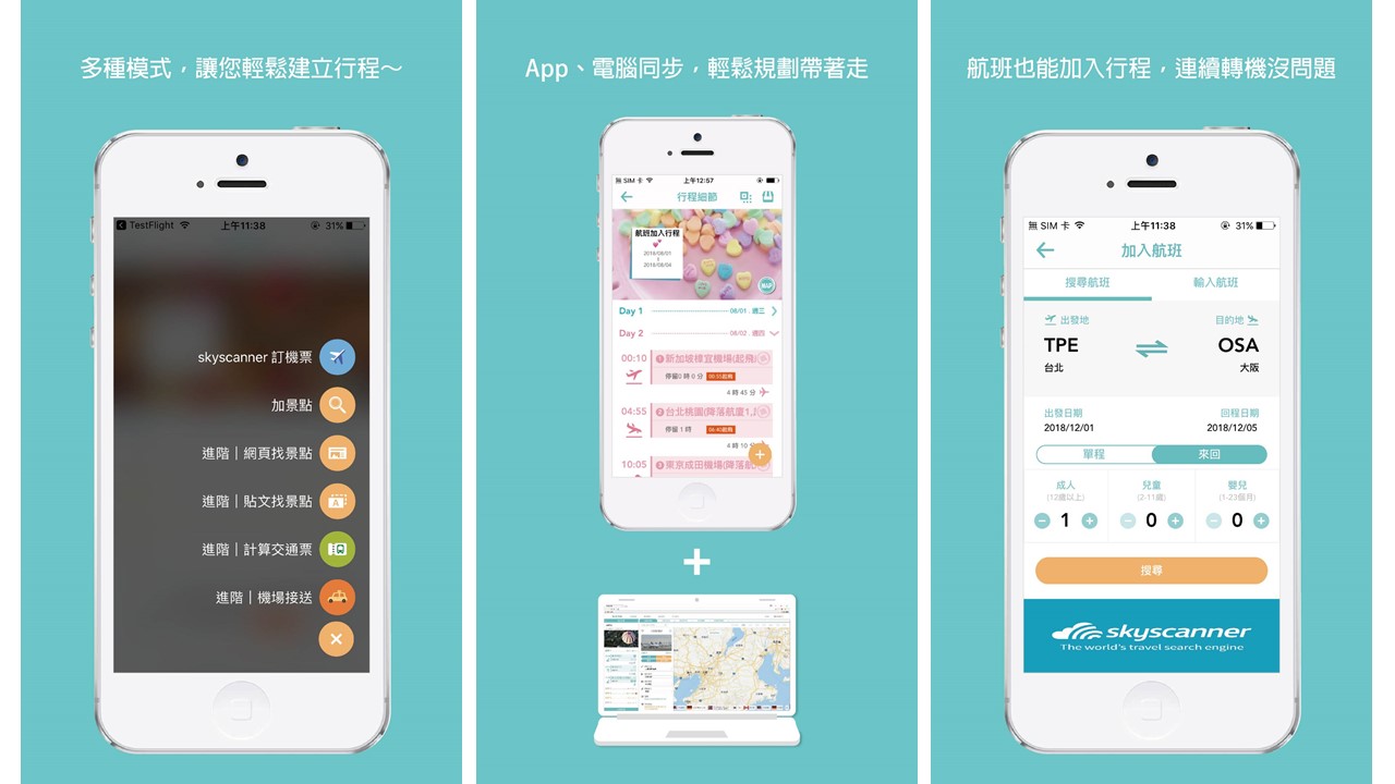 4. 垂直整合多元服務,系統已經整合Skyscanner機票比價、預定服務,航班資訊只要一鍵就能排入行程表;未來更將開放「訂房」、「叫車」、「旅遊門票、體驗24HR閃電預定」等多項服務;旅行蹤表示只要是在 旅行蹤上預訂的,未來都能直接在行程表中開啟電子票,直接使用!不再需要重複點開不同網站APP、或擔心紙本票券遺失。