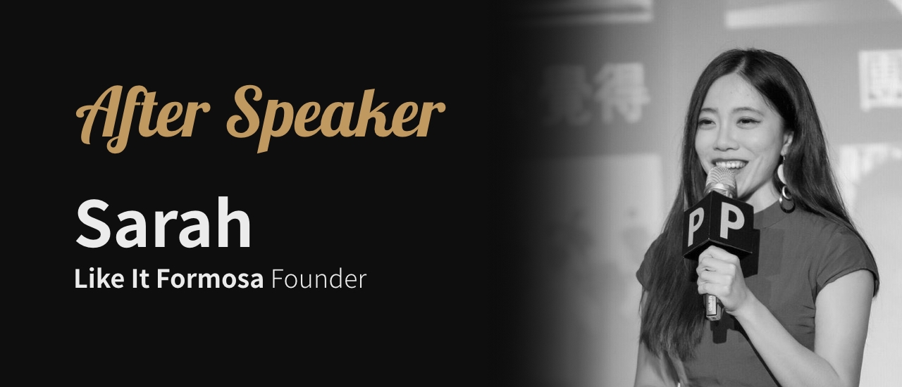 Sarah,曾任外商投資銀行分析師,《I Charleston the World》台北版共同發起人,PitchCamp 2018台灣創業路演巔峰對決冠軍。大學在西班牙交換的一年中開始接觸Free Walking Tour,愛上了這種由當地人帶路,告訴旅人私房景點與在地故事的旅遊方式,於是回台灣後創立了Like It Formosa,培育外語能力優異的年輕人向外國人介紹自己居住的城市。