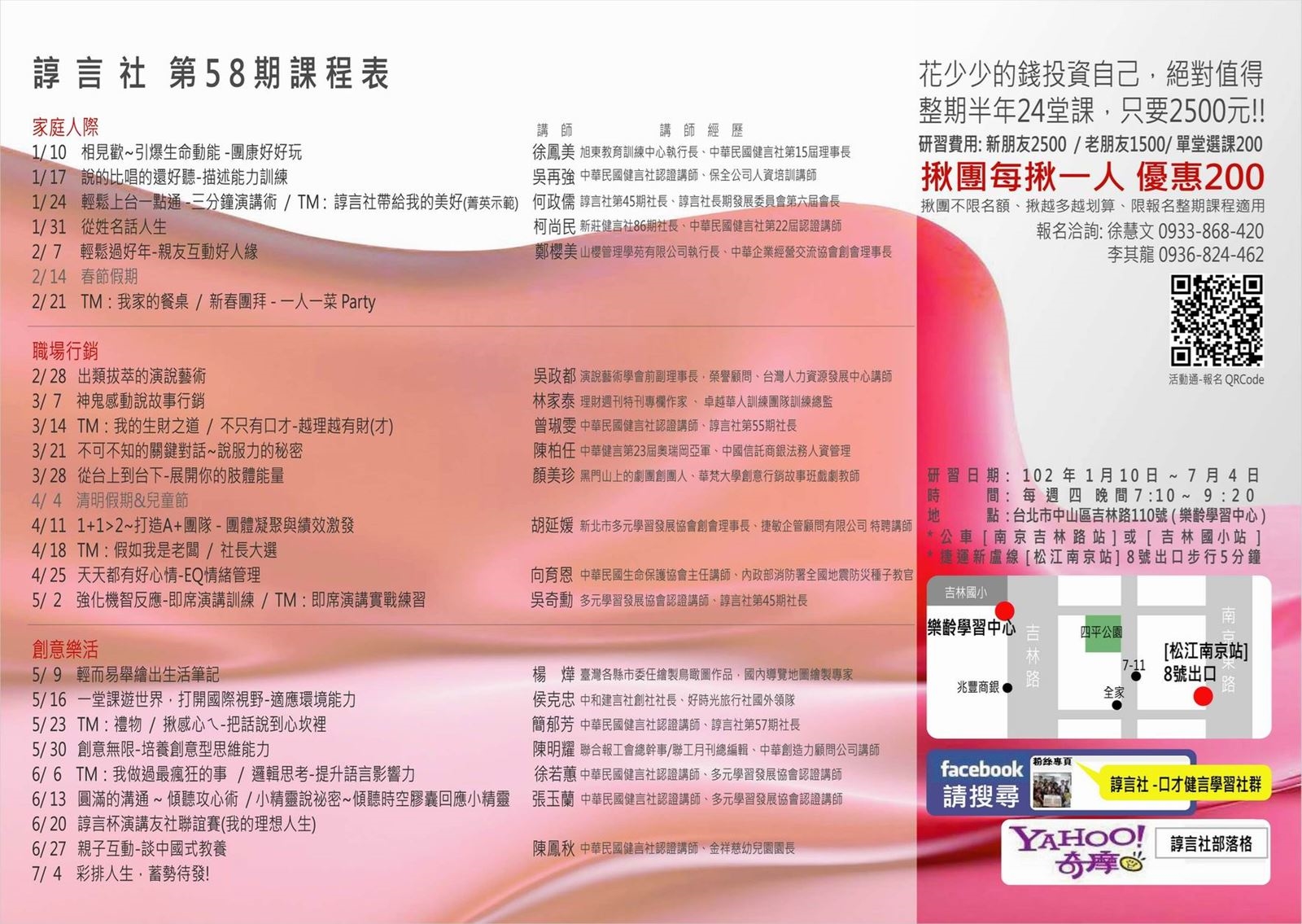 *諄言社58期課程上課時段:102 年 1月10日 ~7 月 4 日 ((( 每 週 四 晚上 7 : 10 ~ 9 : 20 )))