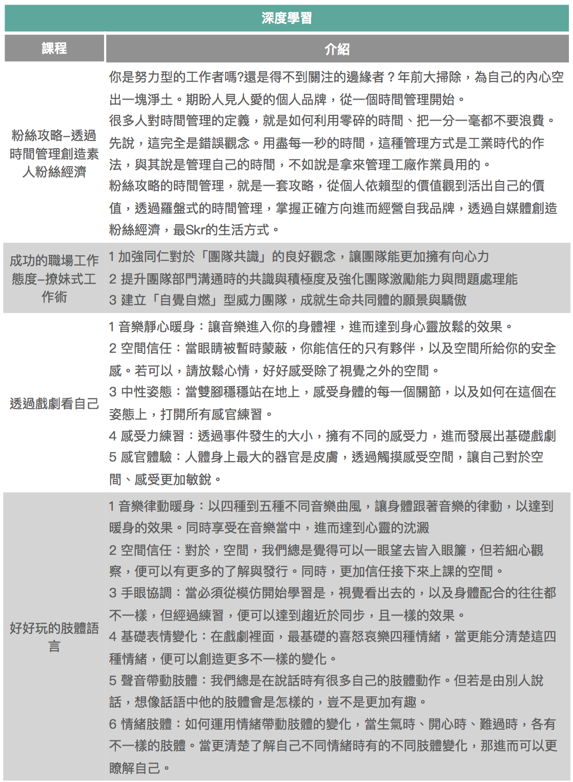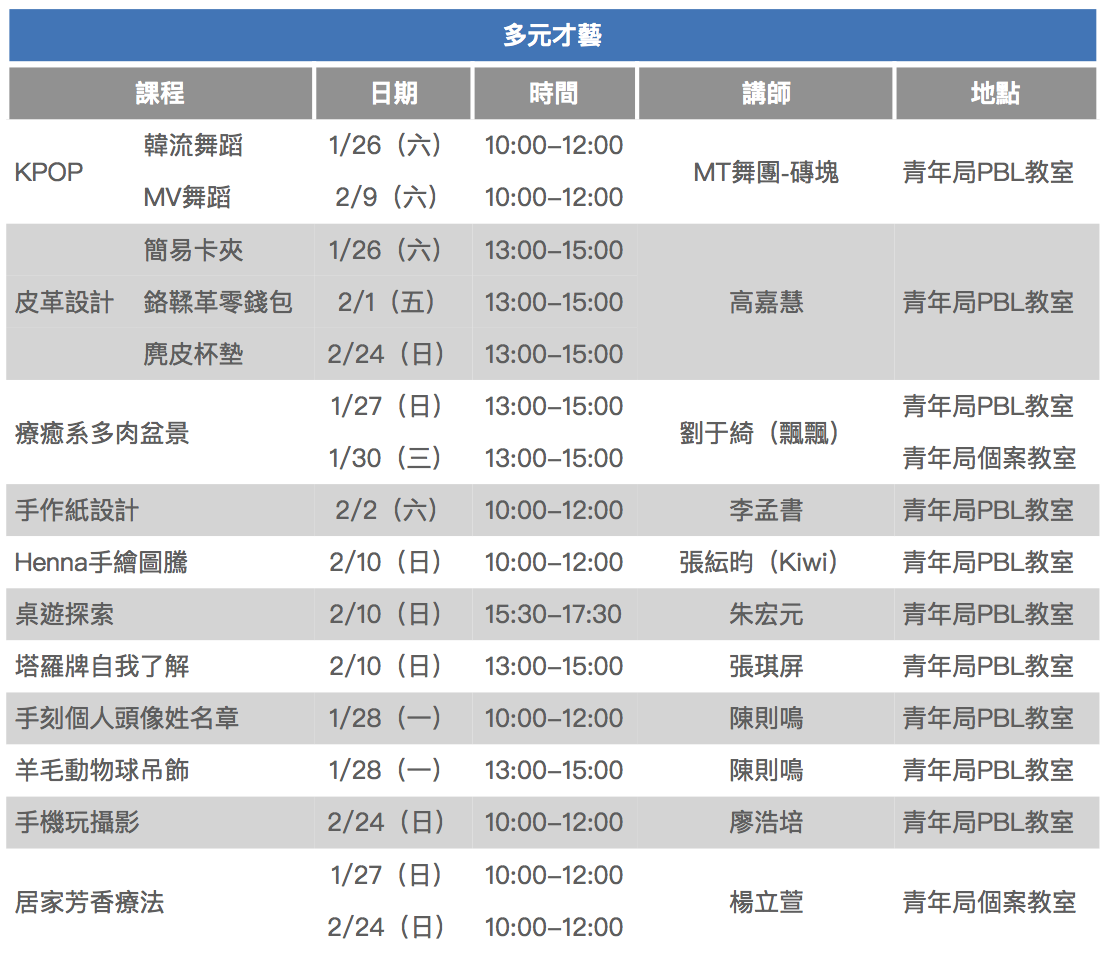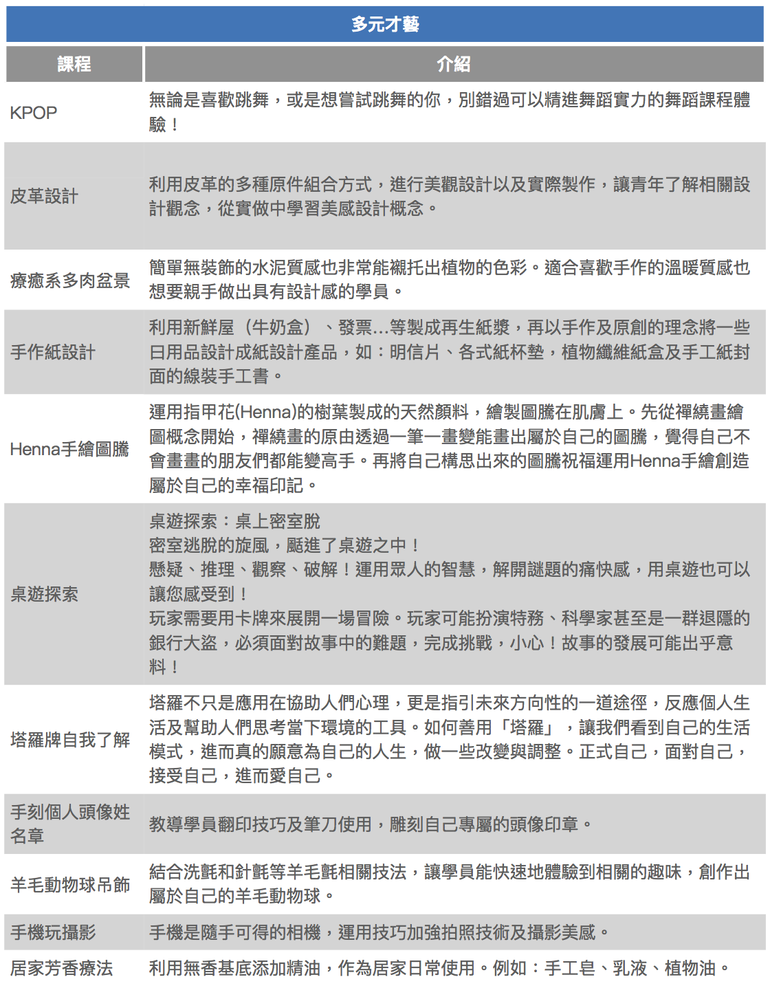 ■ 多元才藝:提供青年學業、工作之外的休閒活動,培養興趣、開創斜槓可能 。