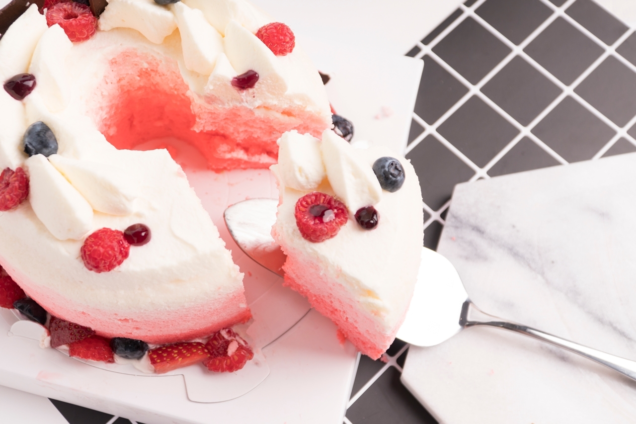 雪白天使蛋糕基底,口感清爽綿密,瀰漫淡淡的檸檬香氣 多款豔紅莓果鑲滿蛋糕,每一口都能嚐出酸甜層次口感