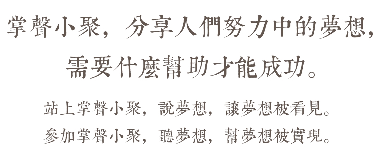 來掌聲小聚,我們請您喝咖啡。當然,喝咖啡、聽故事還不夠,您可以再給夢想家三個幫助: