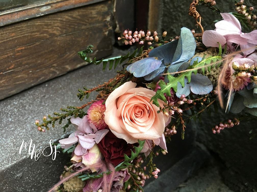 像星星般、點點撒下的粉色艾利佳,落在芒萁與葡萄藤交纏的圈上,每一分彎曲的弧度都是最精細的工藝,偶爾堆疊、偶爾層遞,似有跡可循、又顯渾然天成,如何將自然的花兒風貌在手中巧妙地重現,是我們這一堂課亟欲傳授給妳/你的。