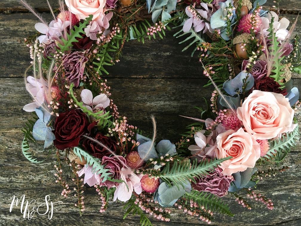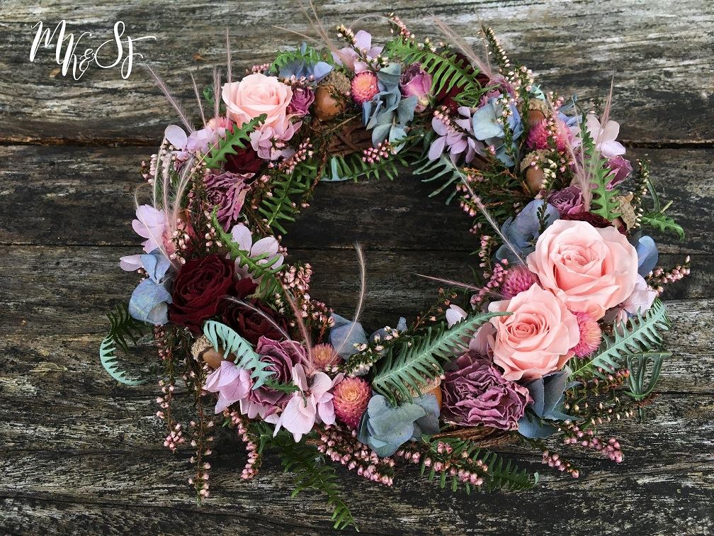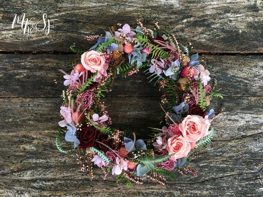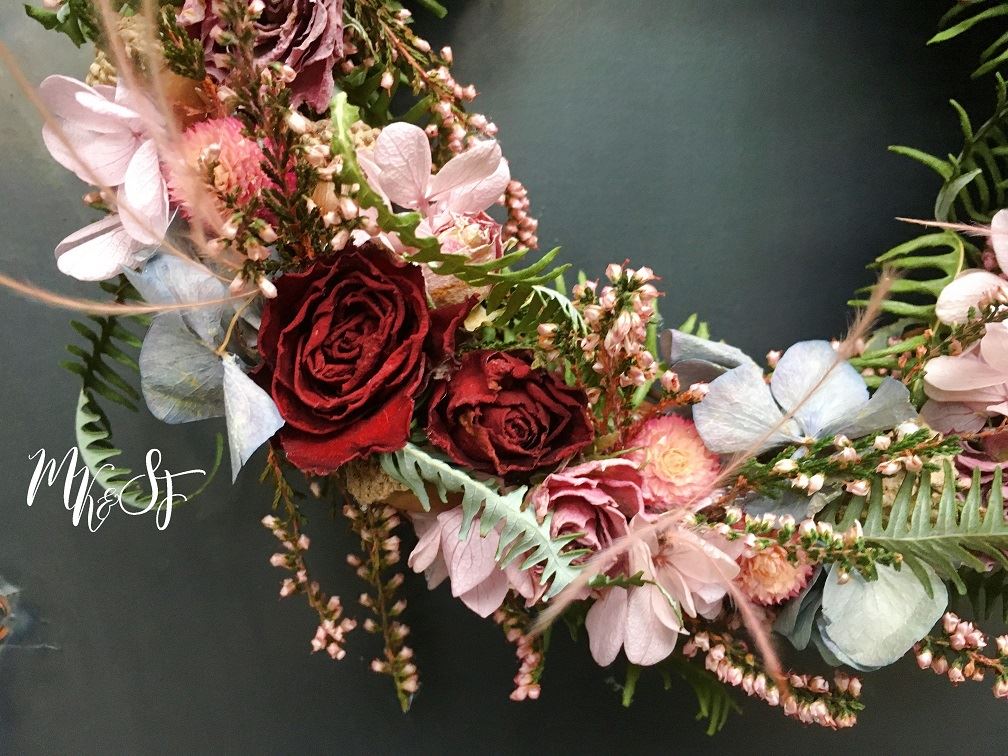 雨滴綿綿落下之際,乾燥花兒的色彩也悄然換季。試著用稍微沉穩的色彩妝點一個圈,讓空間頓時充滿靜謐舒適的氣息。