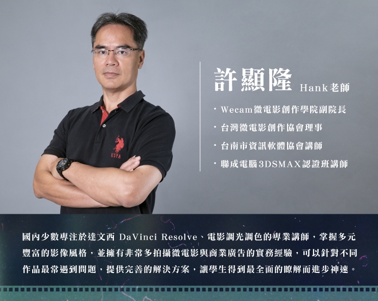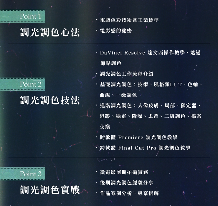 這門課中除了教授達文西,同時也會結合 Premiere 與 Final Cut Pro 在調光調色上的特色與功能差異進行全方位實務教學。