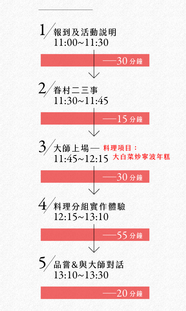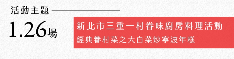 01月26日,眷味料理實作體驗第六道菜,歡迎您報名參加,一起動手學料理,一起品嘗經典的眷村菜式,絕對是假日最棒的選擇哦!