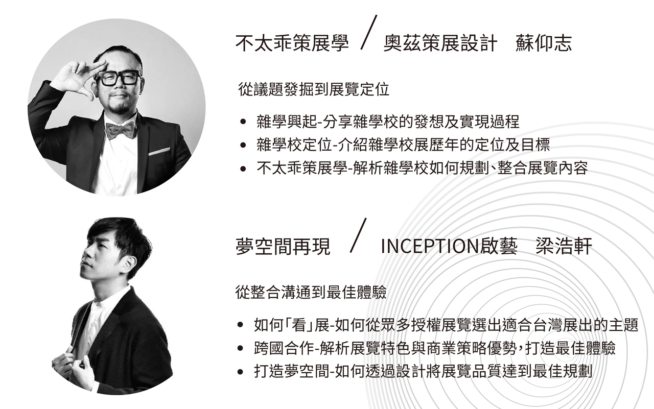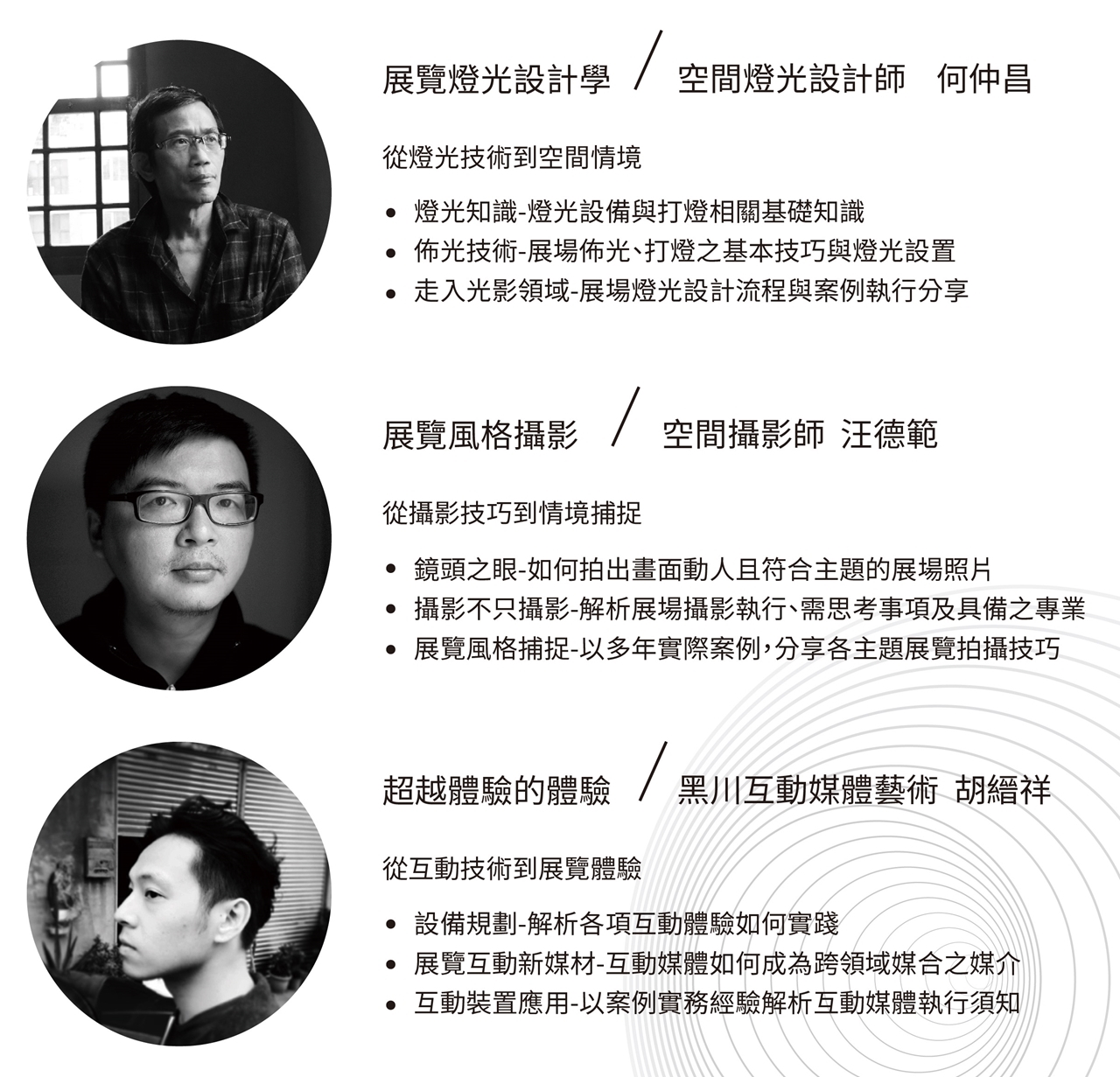 『報名已額滿,若對相關活動有興趣,歡迎來信: lily@bluedragon.com.tw 洽詢』活動介紹 /『一檔精采的展覽,從初期策劃到技術層面的著墨與實踐,是一連串縝密思考的過程後所得到的最好安排。』深度自造將從【展覽企劃】與【展場實務】兩面向透徹解析,探討如何由淺至深的規劃一檔好的展覽。藉由邀請台灣展覽界各領域知名專家,完整分享各自豐富的實務經驗與展場的深刻解析。課程師資 / (一) 展覽企劃(二) 展場實務課程資訊 /3/23 (六) 展覽企劃 共兩堂13:15 – 15:15展覽企劃|不太乖策展學15:30 – 17:30展覽企劃|夢空間再現 3/24 (日) 展場實務 共三堂10:00 – 12:00燈光設計|展覽燈光設計學13:15 – 15:15展場攝影|展覽風格攝影15:30 – 17:30展覽互動藝術|超越體驗的體驗課程費用 /*深度自造雙日課程方案為2500元*早鳥優惠價 :凡2019/2/14(四)前報名,五堂完整課程早鳥價2000元*三人同行優惠價6000元,每人2000元報名與購票注意事項說明 /*10人以上團報另有優惠,歡迎來電洽詢*因課堂空間有限,如額滿即截止報名*主辦單位保有課程內容與講師變更之權利活動洽詢:lily@bluedragon.com.tw / 02-7730-8830 #2077 程小姐主辦單位:蔚龍藝術有限公司、濕地 | venue