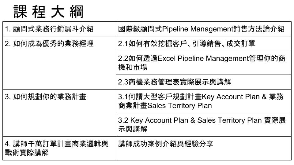 講師將會結合實際的案例,教會你顧問式銷售手法以及大型客戶與市場規劃計畫,透過課堂上的討論與諮詢,協助你在職場中擴展業務並成交訂單!