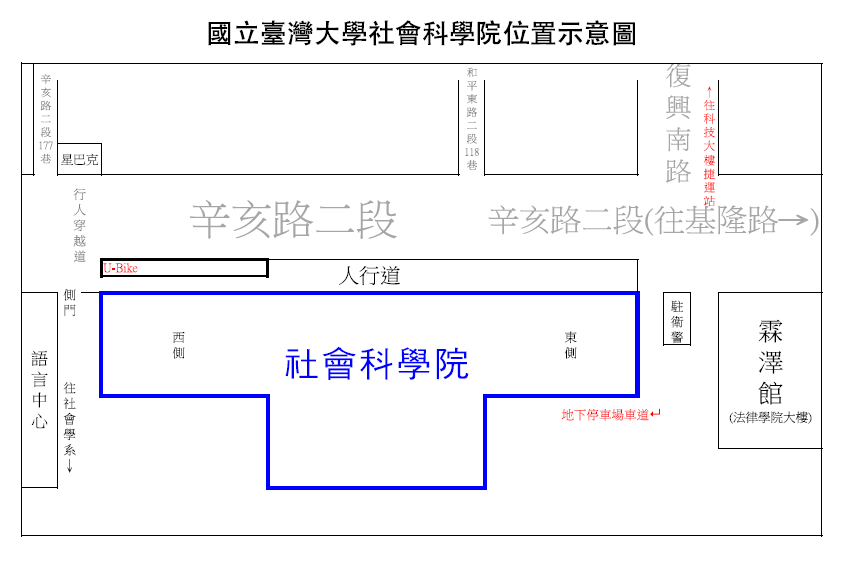 請1.由復興南路往南穿過辛亥路進入臺大北門,再右轉進入停車場。2. 由辛
