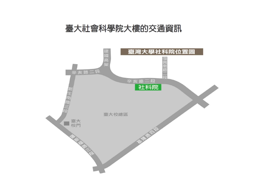 步行至辛亥路交叉口,過馬路即可抵達臺大北門,右手邊大樓即為社會